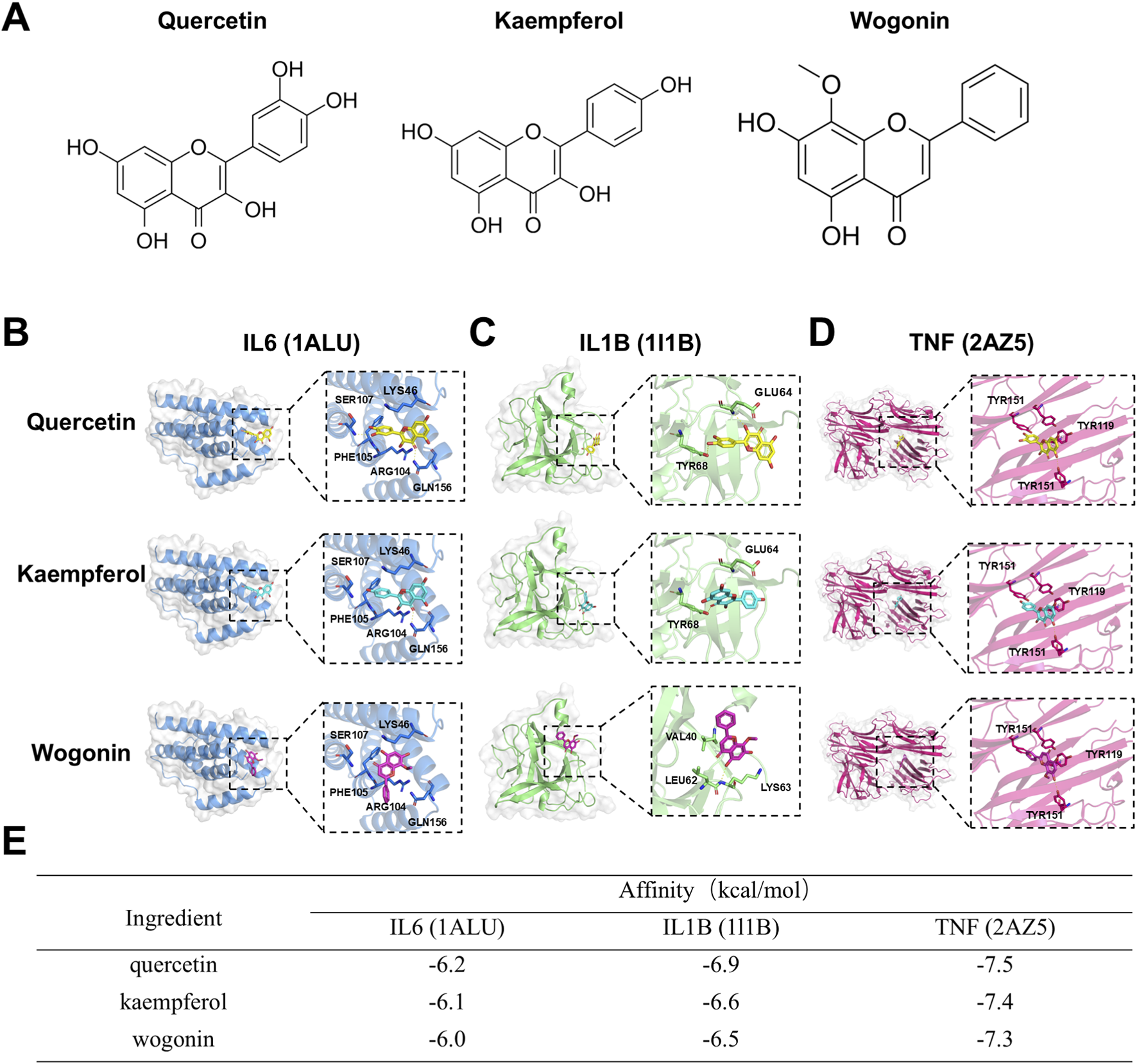 Figure 5. Molecular docking between key active ingredients in CLMD and the key targets selected by machine learning. (A) Molecular formulas of quercetin, kaempferol, and wogonin. (B) Quercetin docking with IL6, IL1B, and TNF. (C) Kaempferol docking with IL6, IL1B, and TNF. (D) Wogonin docking with IL6, IL1B, and TNF. (E) Binding energy table showing interactions between key active ingredients in CLMD and the key targets selected by machine learning.