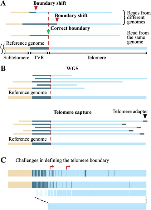 Figure 5. Challenges in estimating TL from long-read sequencing data. (A) Alignment of reads to a non-identical reference genome may lead to inaccurate determination of the telomere boundary. (B) Telomere capture techniques allow selection of only full-length telomeric reads and enable more accurate TL measurement. (С) The complexity of TVR patterns hampers precise delineation of the proximal telomere boundary.