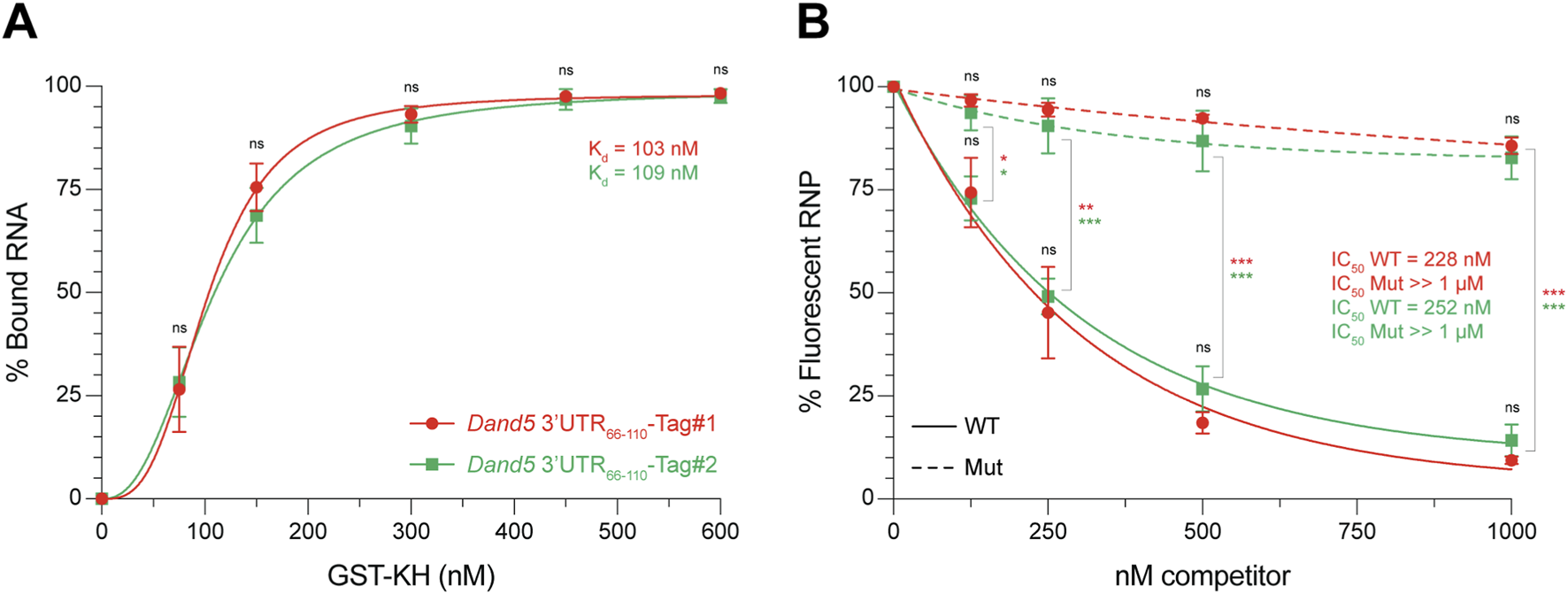 EMSA-based quantification of Kd and IC50 values of sequence-specific GST-KH binding to the Dand5 3′UTR66-110. (A) Binding curves showing the interaction between GST-KH and Dand5 3′UTR66-110 RNA labeled with fluorescent Tag#1 (in red) or Tag#2 (green) duplexes, as described in Figure 3. The percentage of bound RNA is plotted against increasing concentrations of GST-KH. Apparent dissociation constants (Kd) are shown on the graph. They were calculated by nonlinear regression using a one-site binding model with Hill slope: Y = Bmax*Xh/(Kdh + Xh), where Y is the percentage of bound RNA, X is the protein concentration, Bmax is the maximal binding (plateau), Kd is the apparent dissociation constant, and h is the Hill slope (indicator of binding cooperativity). Data are means ± SD from 4 independent experiments. (B) Competition curves of pre-formed fluorescent RNPs (Tag#1 or Tag#2) by unlabeled wild-type (WT, solid lines) or mutant (Mut, dashed lines) competitor RNAs, as described in Figure 4. The percentage of fluorescent RNP is plotted against increasing concentrations of competitor RNA. IC50 values are shown on the graph. They were determined using a one-phase decay nonlinear regression model: Y = (Y0 – Plateau) × e-kX + Plateau, where Y is the percentage of fluorescent RNP, X is the competitor RNA concentration, Y0 is the percentage of fluorescent RNP in absence of competitor, Plateau is the percentage of fluorescent RNP at the highest dose of competitor, and k is the apparent rate constant. The concentration resulting in a half-maximal decrease corresponds to X = −1/K × Ln ((50-Plateau)/(Y0-Plateau)). Data are means ± SD from 3 independent experiments. ns: not significant, *p < 0.05, **p < 0.01, ***p < 0.001 (Student’s t-test).