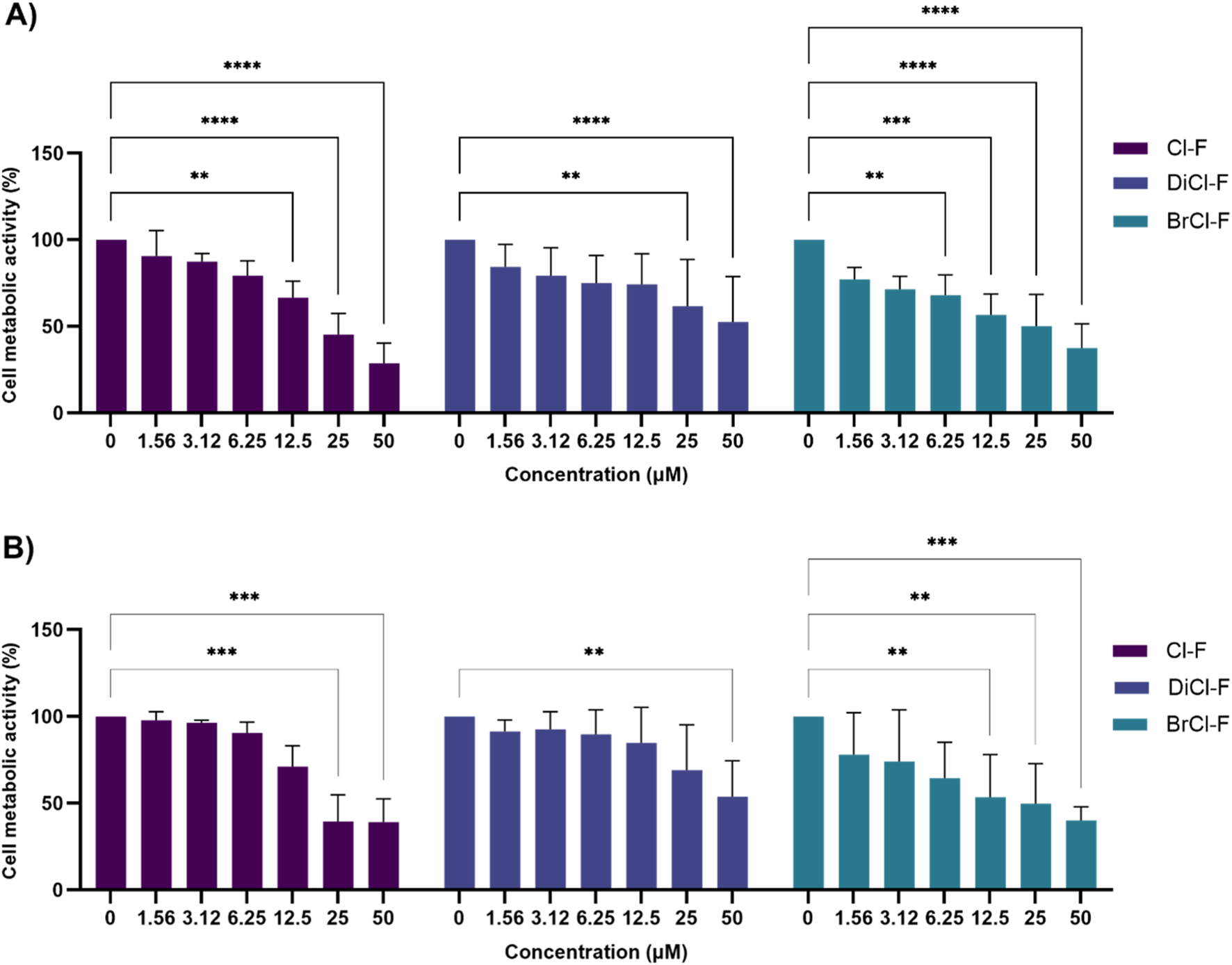 Figure 2. Effects of halogenated flavones - 4′-chloroflavone (Cl-F), 6,8-dichloroflavone (DiCl-F), and 8-bromo-6-chloroflavone (BrCl-F) on metabolic activity in CLBL-1 and CLB70 cell lines. Cells were treated with increasing concentrations (1.56–50 µM) of the tested compounds for 72 h, and metabolic activity was measured by the MTT assay. Data are expressed as mean ± SD from four independent experiments. Statistical significance vs. control: *p < 0.05; **p < 0.01; ***p < 0.001; ****p < 0.0001. (A) CLBL-1 (B) CLB70.