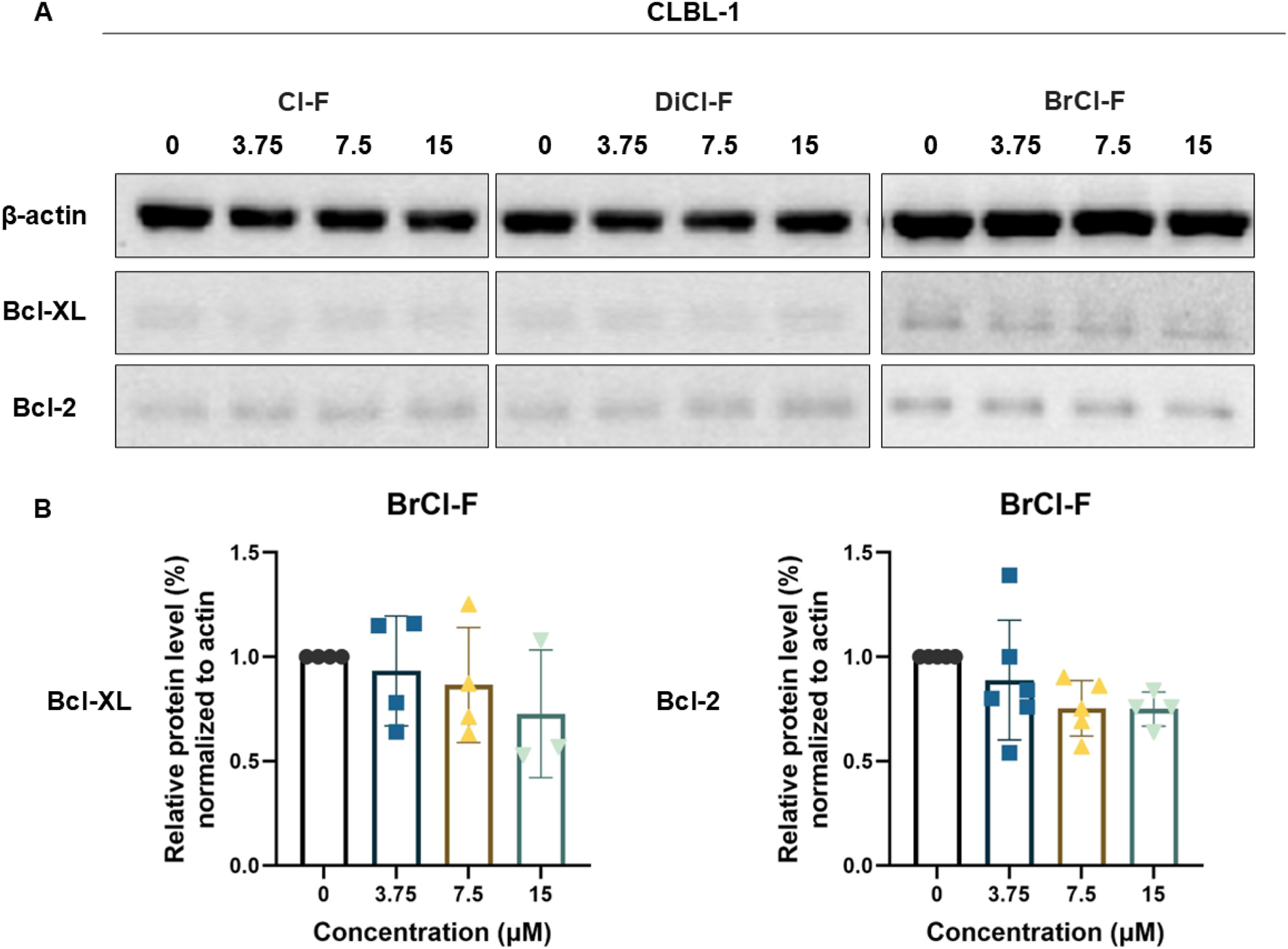 Figure 6. (A) Representative immunoblots of Bcl-XL and Bcl-2 in CLBL-1 cell line after 48 h treatment with Cl-F, DiCl-F, and BrCl-F at 3.75, 7.5, and 15 µm. (B) Relative protein expression level of Bcl-XL and Bcl-2 were normalized to β-actin protein and expressed relative to untreated cells. Data represent mean ± SD from five independent experiments.