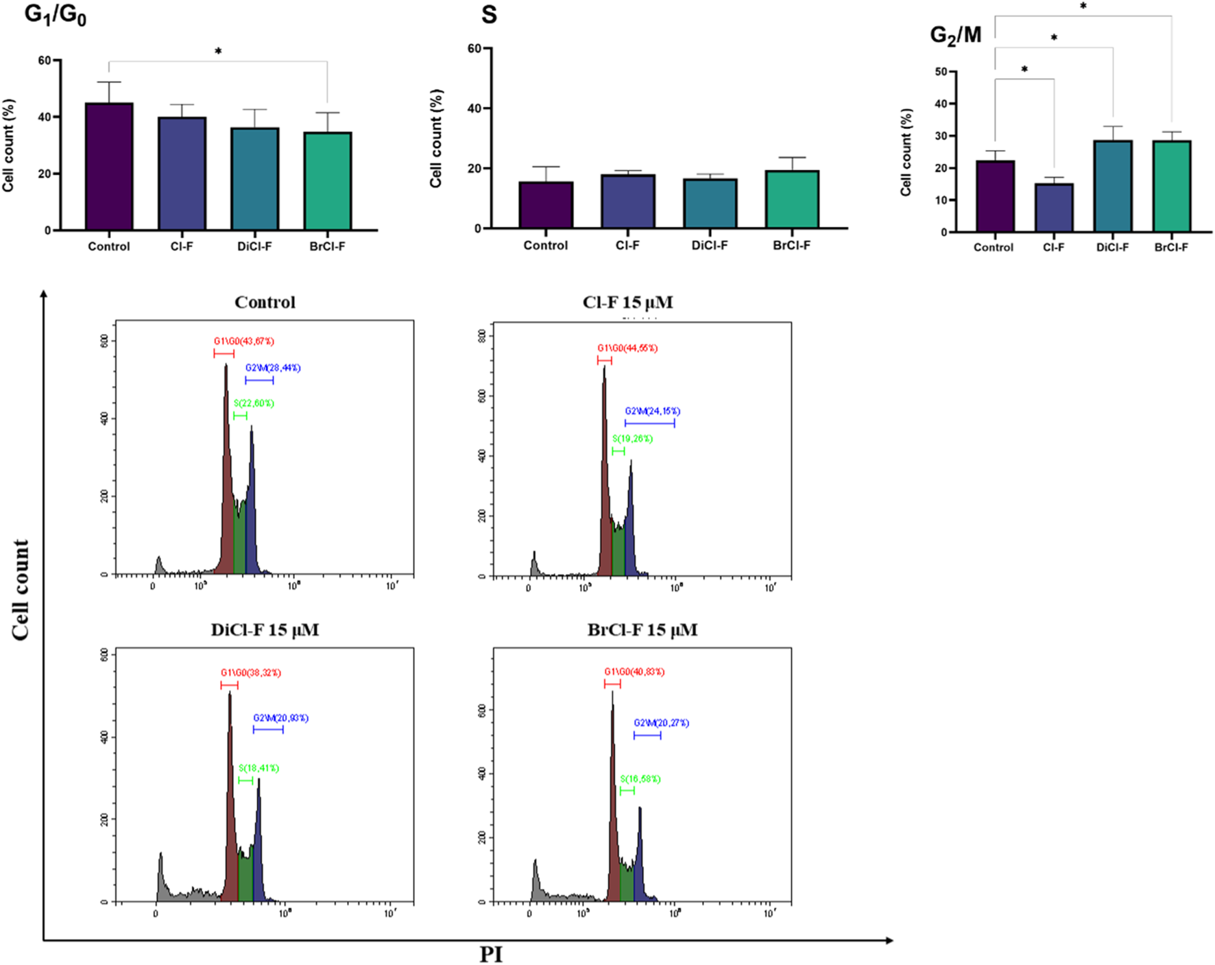 Figure 8. Histograms and percentage of CLBL-1 cells in G0/G1, S, and G2/M phases after treatment with 15 µM of Cl-F, DiCl-F, or BrCl-F. Data represent mean ± SD from three independent experiments. Statistical significance vs. untreated control: *p < 0.05.
