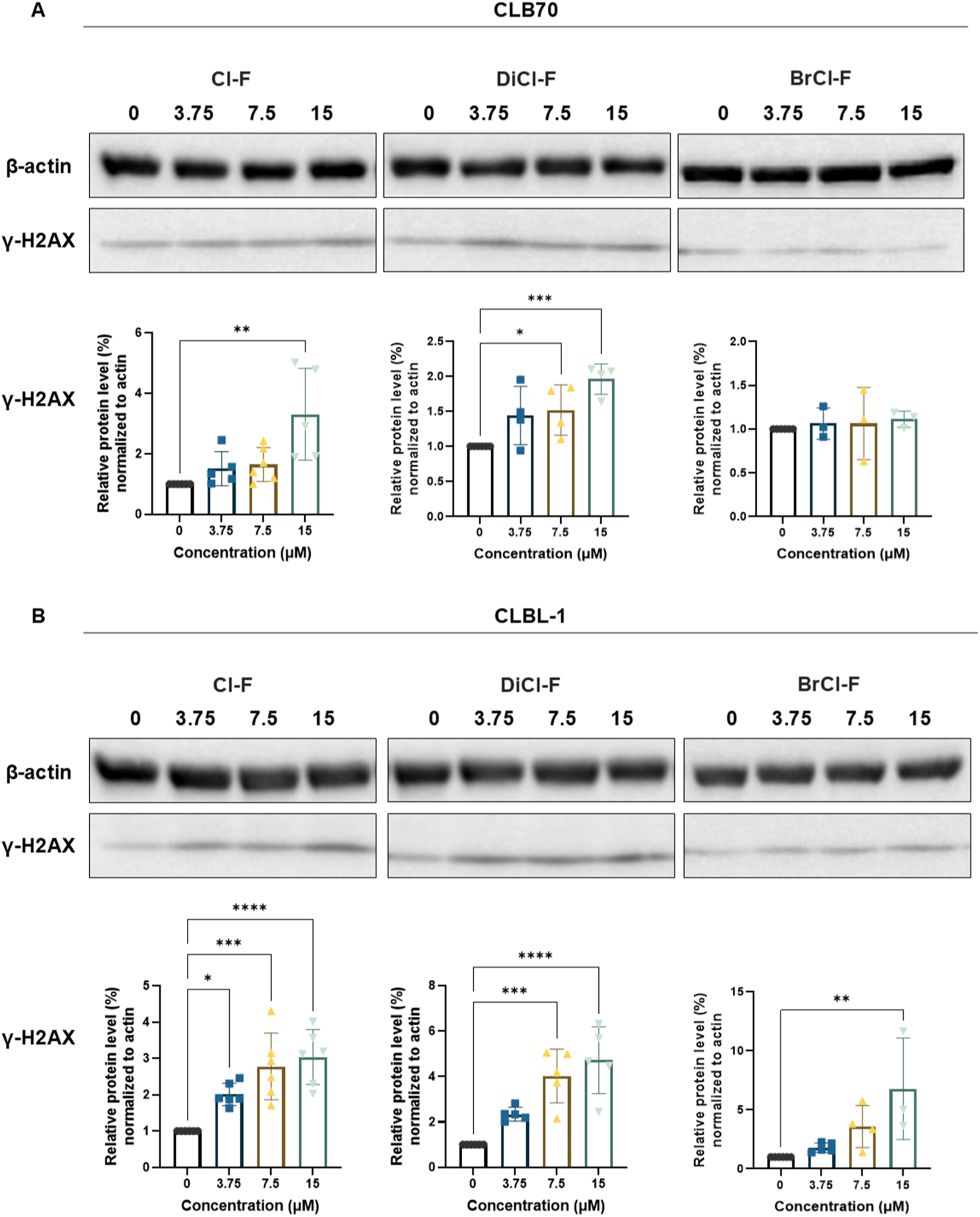 Figure 9. Relative expression levels and representative immunoblot of γH2AX in CLB70 (A) and CLBL- 1 (B) cells after 48 h treatment with Cl-F, DiCl-F, and BrCl-F at 3.75, 7.5, and 15 µM. Protein levels were normalized to β-actin control and expressed relative to untreated cells. Data represent mean ± SD from five independent experiments. Statistical significance vs. control: *p < 0.05; **p < 0.01; ***p < 0.001; ****p < 0.0001.