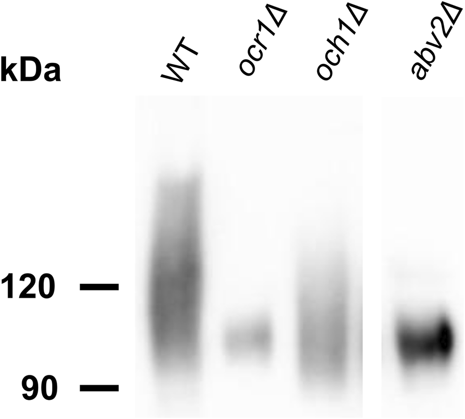 Growth of M257 (WT), M257-MP9 (mnn4Δ), M257-620M1 (abv1Δ), M257-620-MP9 (abv1Δ mnn4Δ), M257-759M1 (abv2Δ), M257-620-759M1 (abv1Δ abv2Δ), M257-MP6 (och1Δ), M257-620-MP6 (abv1Δ och1Δ), M257-620-MP9-MP6 (abv1Δ mnn4Δ och1Δ), and M257-1055 (ocr1Δ) strains on solid YPD medium. Overnight YPD cultures were 1000-fold diluted with YPD and 4 additional 5-fold step dilutions were prepared and spotted onto YPD plate and incubated overnight at 37 °C.
