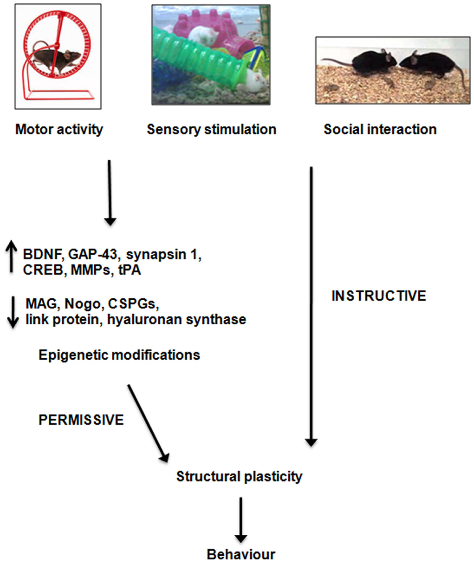 Possible mechanisms of action of enriched stimulation on structural plasticity. Enriched stimuli, which can comprise increased motor activity, sensory stimulation or social interaction, modulate the expression of several growth-regulatory cues, and alter chromatin structure, so to create permissive conditions for neuronal plasticity and behavioral adaptation. In addition, external stimulation provides the involved neurons with instructive information, needed to shape connections patterns able to sustain adaptive functions. BDNF, brain-derived neurotrophic factor; GAP-43, growth-associated protein-43; MMP, matrix metalloproteinase; tPA, tissue plasminogen activator; MAG, myelin-associated glycoprotein; CSPG, chondroitin sulfate proteoglycan.