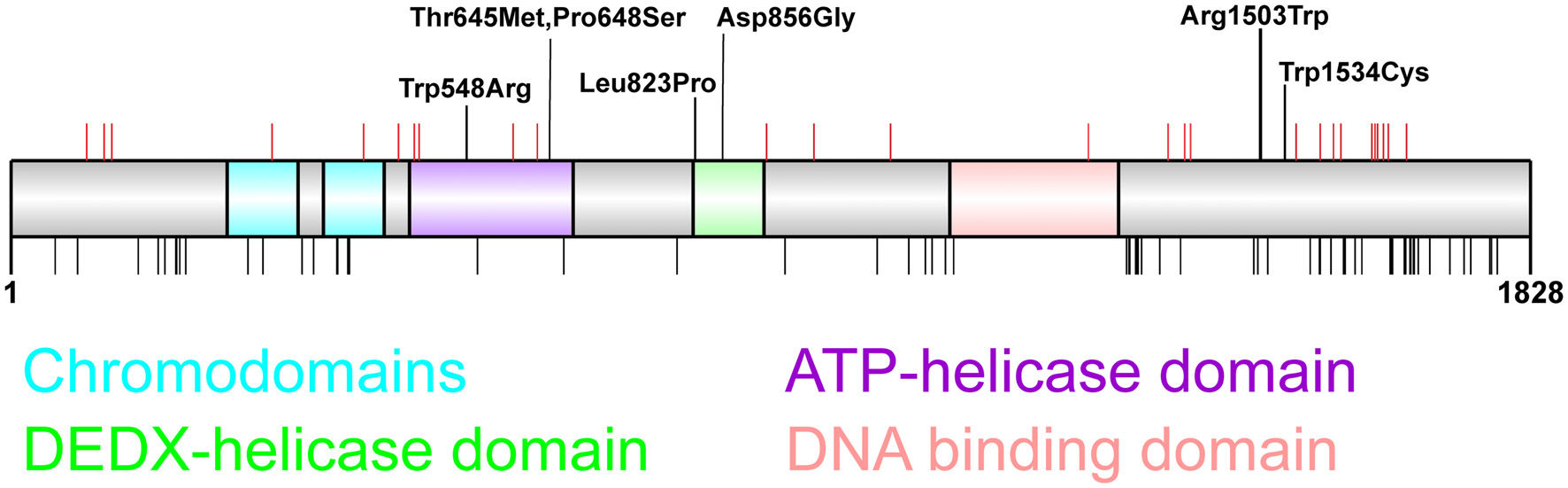 CHD2 is a chromatin remodeler that acts as an ATPase to catalyze the assembly of chromatin into periodic nucleosome arrays (Liu et al., 2015). CHD2 is composed of several functional domains, including 2 chromodomains at the N-terminus, an ATPase/helicase domain, and a DNA-binding domain (Figure 1). Experiments using CHD2 deletion constructs identified specific functions of individual CHD2 domains and found that the N-terminus of CHD2, containing the two chromodomains, serves an autoinhibitory role. Deletion of this region increases both DNA-binding and ATPase activities, however this N-terminal region of CHD2 is required for the chromatin remodeling activity of the protein (Liu et al., 2015). The DNA binding domain is able to sense double stranded DNA and enhances the chromatin remodeling activity of CHD2 (Liu et al., 2015).