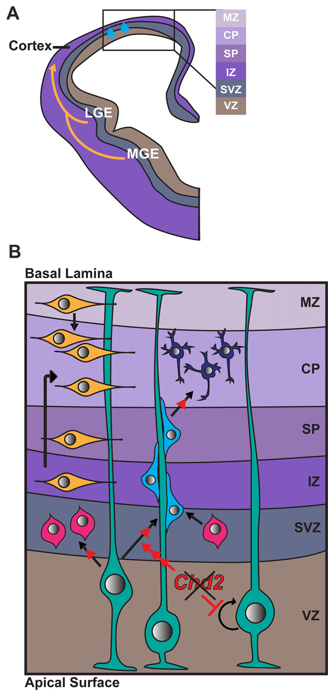 The mammalian cerebral cortex is comprised of two major neuronal cell types, glutamatergic excitatory neurons and GABAergic inhibitory interneurons that are derived from distinct processes occurring during neurodevelopment. Cortical excitatory neurons are born in the ventricular and subventricular zones (VZ/SVZ) of the dorsal telencephalon (Figures 2A,B). Here radial glia cells divide either symmetrically to expand the progenitor pool, or asymmetrically to produce either a single radial glia cell along with an intermediate progenitor or neuron (Figure 2B; Paridaen and Huttner, 2014). Cortical inhibitory neurons are generated from distinct neuronal progenitor cells located primarily in the lateral ganglionic eminence (LGE), medial ganglionic eminence (MGE) and caudal ganglionic eminence (CGE) of the ventral forebrain. These neurons migrate tangentially into the dorsal forebrain and integrate in the cerebral cortex (Figure 2A). CHD2 has been shown to play a role in the development of both cortical excitatory and inhibitory neurons in mice in vivo and humans in vitro.