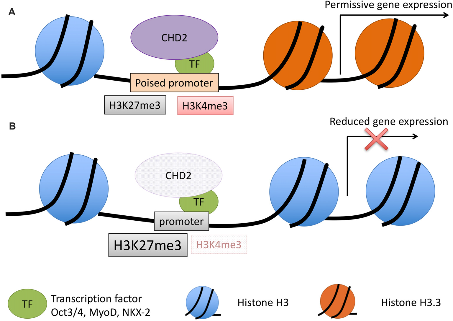 CHD2 is a chromatin remodeler that has demonstrated ability to use the energy from ATP hydrolysis to remodel chromatin into periodic nucleosome arrays (Liu et al., 2015). The role of CHD2 in chromatin remodeling was first investigated in muscle cell differentiation. Co-immunoprecipitation (co-IP) experiments in C2C12 cells found that CHD2 interacts with H3.3, a histone variant incorporated into the nucleosome at transcriptionally active genes; while a mutant form of CHD2 lacking the chromodomain does not show any interaction with H3.3 (Harada et al., 2012). H3.3 is incorporated into myogenic gene promoters prior to their expression, but this incorporation is disrupted when Chd2 is depleted by miRNA knockdown in C2C12s. CHD2 also showed an interaction with MyoD, a master regulator of skeletal muscle differentiation, and together MyoD and CHD2 bind to myogenic gene promoters. Suppression of Chd2 expression in C2C12 cells decreased myogenic gene expression and halted myotube formation, indicating that Chd2 is required for skeletal muscle differentiation. Combined, these data suggest a model where CHD2 is guided to differentiation-dependent genes by other transcription factors (e.g., MyoD in skeletal muscle) and that the chromodomain of CHD2 facilitates H3.3 incorporation into the nucleosome, poising genes necessary for differentiation for expression (Figure 3).