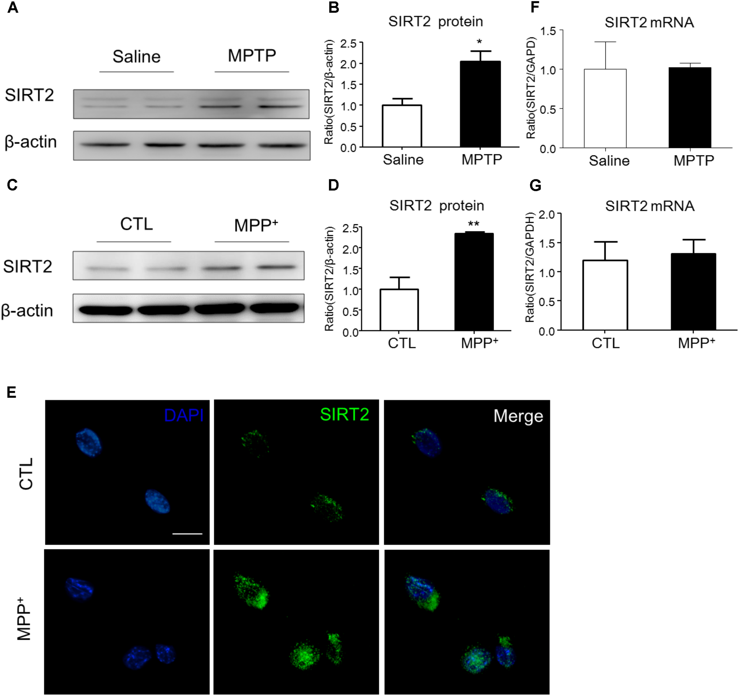 The expression patterns of SIRT2 in PD model. (A–D) Western blotting analysis showed that SIRT2 protein level increased by MPTP treatment or MPP+ stimulating, respectively. (E) Immunohistochemistry staining showed a significant increment of SIRT2 in SH-SY5Y cells by MPP+ stimulation, compared with controls. Scale bar: 40 μm. (F,G) Quantitative RT-PCR analysis for SIRT2 mRNA level showed no significant difference in midbrain tissues and SH-SY5Y cells under treatment. Data are presented as the mean ± SEM for each group of five mice or three independent in vitro experiments. ∗p < 0.05, ∗∗p < 0.01 versus corresponding control group.