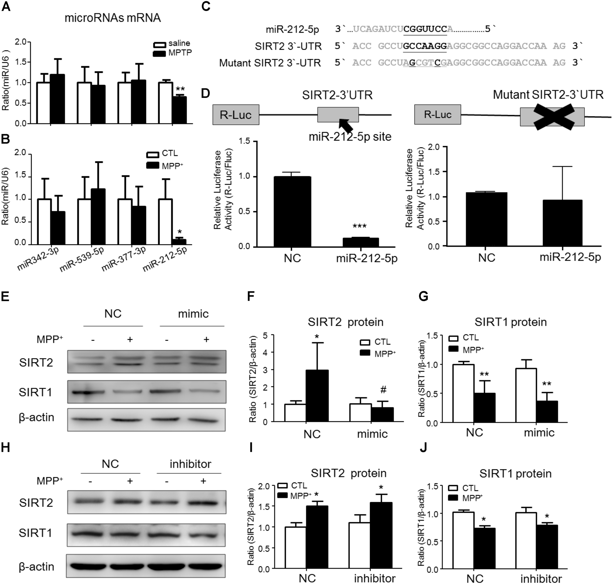 SIRT2 is a target gene of miR-212-5p. (A,B) Quantitative RT-PCR analysis detected some predicted SIRT2-associated microRNAs expression. Results showed miR-212-5p significantly decreased in PD model both in vivo and in vitro. (C) The predicted binding sites of miR-212-5p in the 3′UTR of SIRT2, and schematic description of the base-pairing interaction between miR-212-5p and SIRT2 mRNA. (D) Luciferase reporter assays confirm that SIRT2 is a direct target gene of miR-212-5p in HEK293T cells. (E–G) Transfection of miR-212-5p into SH-SY5Y cells significantly reduced SIRT2 expression but failed to affect SIRT1 expression. (H–J) Anti-miR-212-5p up-regulated SIRT2 expression without significant difference, but had no effect on SIRT1 expression. Data are presented as the mean ± SEM from three independent experiments. ∗p < 0.05, ∗∗p < 0.01, ∗∗∗p < 0.001 versus control or NC-control group; #p < 0.05 versus NC plus MPP+ group. NC, negative control.