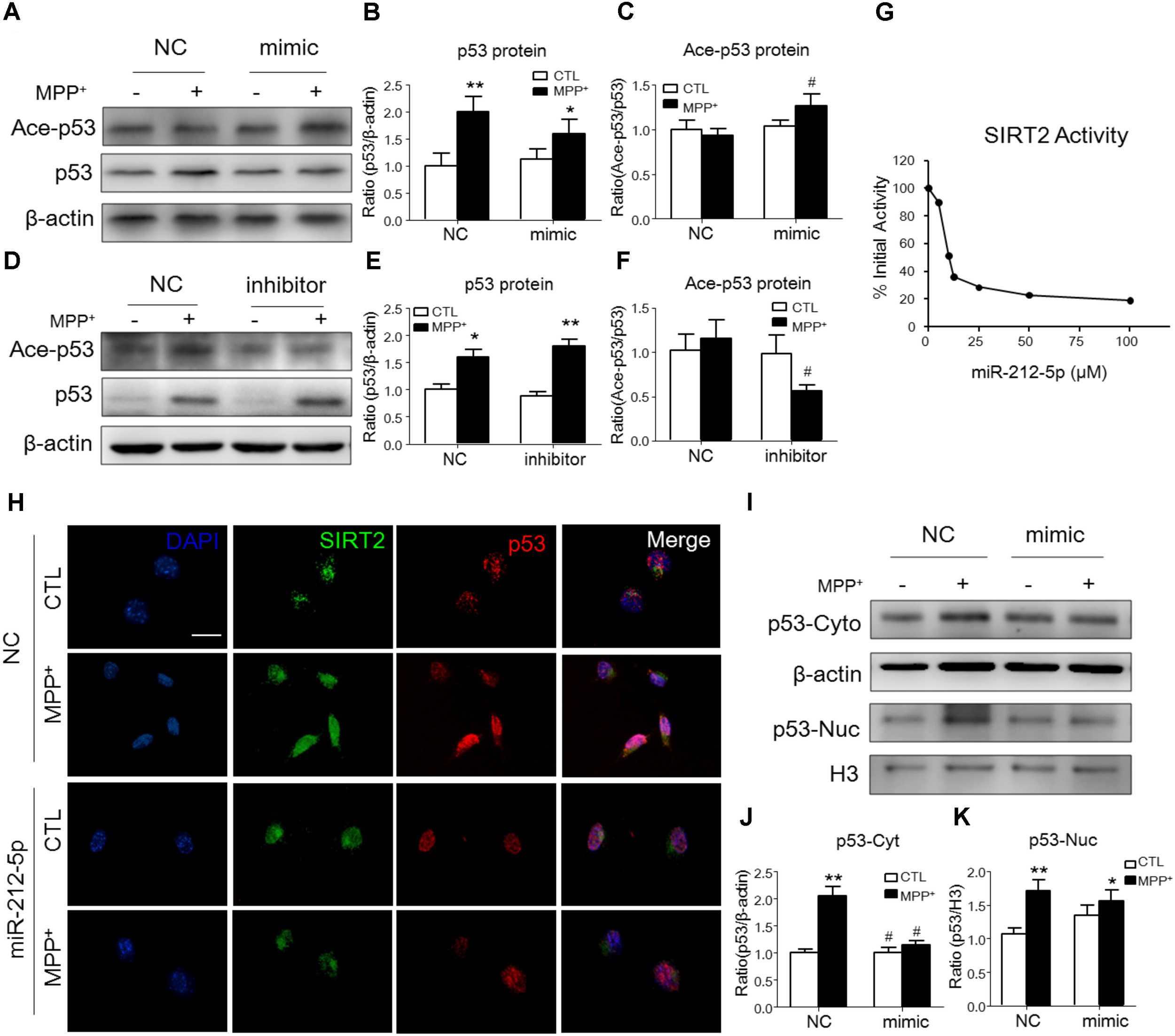 MiR-212-5p regulates p53 sub-localization via SIRT2 activity in PD model. (A,B) Western blotting and quantitative analysis showed that the total p53 expression was highly increased by MPP+ stimulating, which was somehow inhibited by miR-212-5p mimic treatment. (D,E) In contrast, miR-212-5p inhibitor indeed enhanced the increased total p53 expression. Since p53 is a key deacetylation substrate of SIRT2, we detected the acetylation of p53 by Western blotting. Results showed that miR-212-5p regulated the level of acetylated p53 (C,F). (G) SIRT2 activity assay revealed that miR-2125p could suppress the deacetylation potential of SIRT2. (H) Double immunofluorescence of SIRT2 (green) and p53 (red). Scale bar: 40 μm. Consistent with previous results, SIRT2 and p53 were highly increased under MPP+ treatment, which was inhibited by miR-212-5p transfection. (I–K) Western blotting and quantitative analysis showed that p53 was up-regulated both in cytoplasm and nucleus. miR-212-5p transfection suppressed the expression of p53, especially in cytoplasm. ∗p < 0.05, ∗∗p < 0.01 versus control or NC-control group; #p < 0.05, ##p < 0.01 versus NC plus MPP+ group.