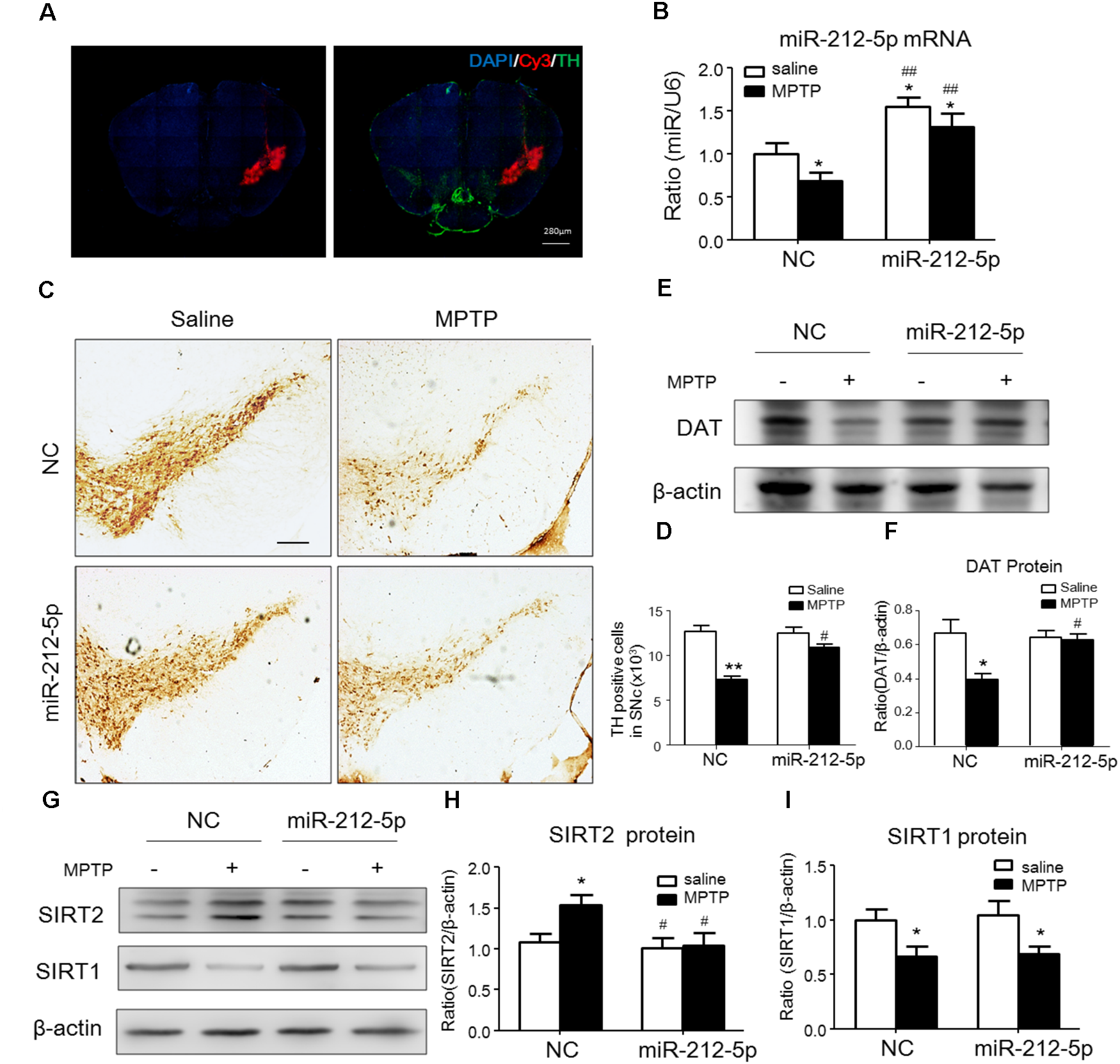 MiR-212-5p decreases SIRT2 expression and attenuates DA neuron loss in vivo. (A) Fluorescent image of Cy3-labeled miR-212-5p (red) and TH-marked neurons (green) was observed in the SNc of mice. (B) RT-PCR analysis of miR-212-5p. (C,E) Representative microphotographs and quantitative analysis of TH in the SNc of MPTP injured mice. Scar bar: 200 μm. (D,F) Western blotting and quantitative analysis showed that DAT was decreased by MPTP-induced PD mice model, which was reversed by miR-212-5p treatment. (G,H) Western blotting and quantitative analysis of SIRT2 and SIRT1. Consistent with the previous founds, SIRT2 was increased and SIRT1 was decreased in MPTP-induce PD mice model. MiR-212-5p treatment decreased SIRT2 expression with no influence on SIRT1. Data are presented as the mean ± SEM for each group of five mice, Two-way ANOVA, ∗p < 0.05, ∗∗p < 0.01 versus NC with saline treatment; #p < 0.05, ##p < 0.01, ###p < 0.001 versus NC with MPTP-treatment.