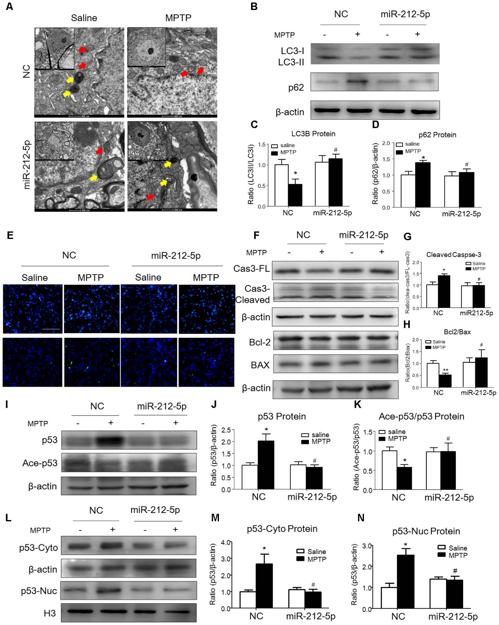 MiR-212-5p promotes p53-dependent autophagy and inhibits apoptosis in vivo. (A) Transmission electron microscope of midbrain in mice. Yellow arrow means autolysosome, red arrow means mitochondrion. (B–D) Representative immunoblots and quantification of midbrain extracts for analysis of LC3B and P62 in mice of both normal and MPTP-treatment. (E) TUNEL staining of midbrain in mice. (F–H) Representative immunoblots and quantification of midbrain extracts for analysis of cleaved caspase-3, Bcl-2 and BAX. (I–K) Western blotting and quantitative analysis showed that miR-212-5p decreased total p53 and increased ace-p53 expression in the midbrain of mice. (L–N) Western blotting and quantitative analysis revealed that miR-212-5p decreased both cytosolic and nuclear p53 expression. Data are presented as the mean ± SEM for each group of five mice. ∗p < 0.05, ∗∗p < 0.01 versus NC with saline treatment; #p < 0.05, ##p < 0.01 versus NC with MPTP-treatment.