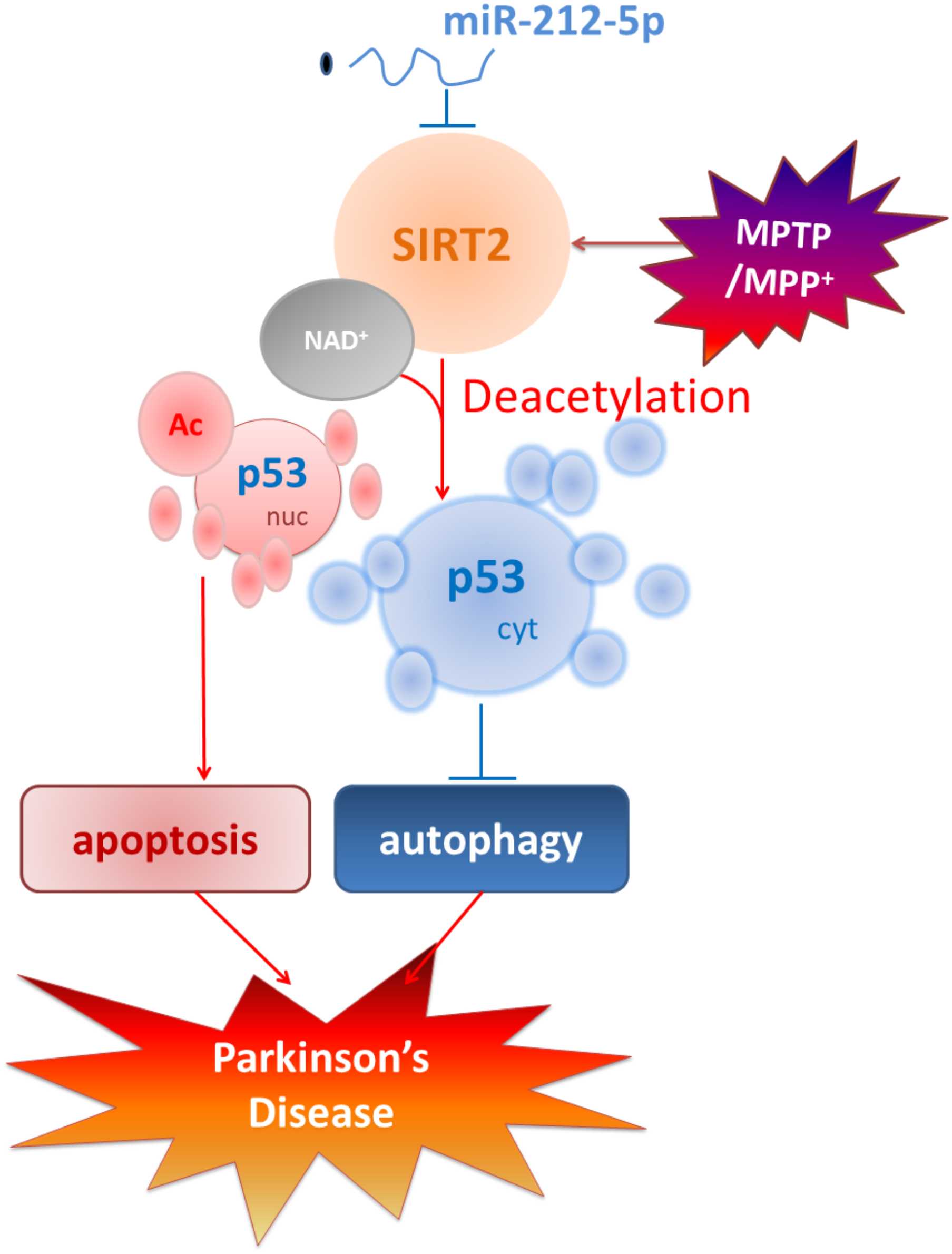 Taken together, as shown in Figure 8, we demonstrate that the miR-212-5p is downregulated and specifically regulate the translation of SIRT2 in the midbrain or SH-SY5Y cells of PD experimental models. Furthermore, inhibition of SIRT2 promotes autophagy by decreases cytoplasmic p53 expression, according to the deacetylation of p53 by SIRT2. Most notably, stereotactic injection of miR-212-5p mimics into midbrain significantly improves the impairment of dopaminergic neuron by targeting SIRT2. Our study provides a direct link between SIRT2 suppression and MPTP-induced neurodegeneration. These findings will give us an insight into the potential of miR-212-5p in opening up novel therapeutic avenues for PD.