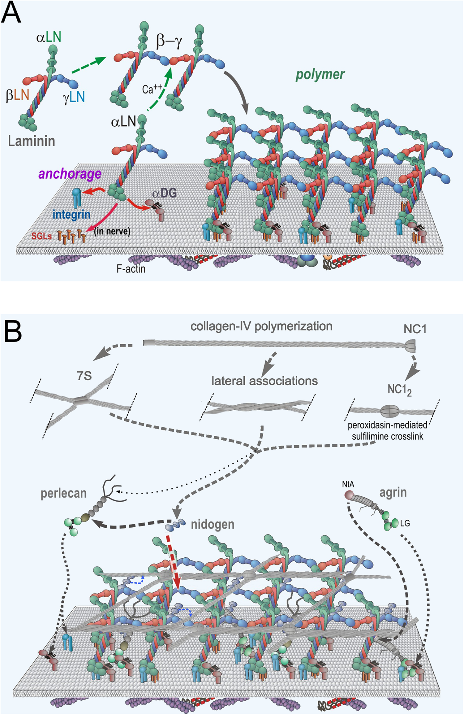 Neuromuscular Basement Membrane Assembly Steps. (A) Laminin becomes anchored to the cell surface by binding to integrins (α7β1 in muscle and several laminin-class integrins on Schwann cells) and α-dystroglycan (αDG) receptors. In Schwann cells, there are additional attachments mediated by sulfated glycolipids (SGLs). The three different LN domains of laminins bind to each other to form a planar polymer, creating an initial matrix scaffolding. Lm411 (a normal components of SC BMs) is unable to polymerize. (B) The G3 domains of nidogen-1 and -2 bind to the Lmγ1-LEb3 domain. Agrin binds to the coiled-coil domain of laminin and to αDG. Perlecan, another HSPG, binds to the nidogen G2 domain and to αDG. Collagen-IV binds to the G2 nidogen domain and forms a second polymer through covalent N- (7S) and C-(NC1) terminal domain bonds. Non-covalent lateral associations force the collagen into a tighter network.