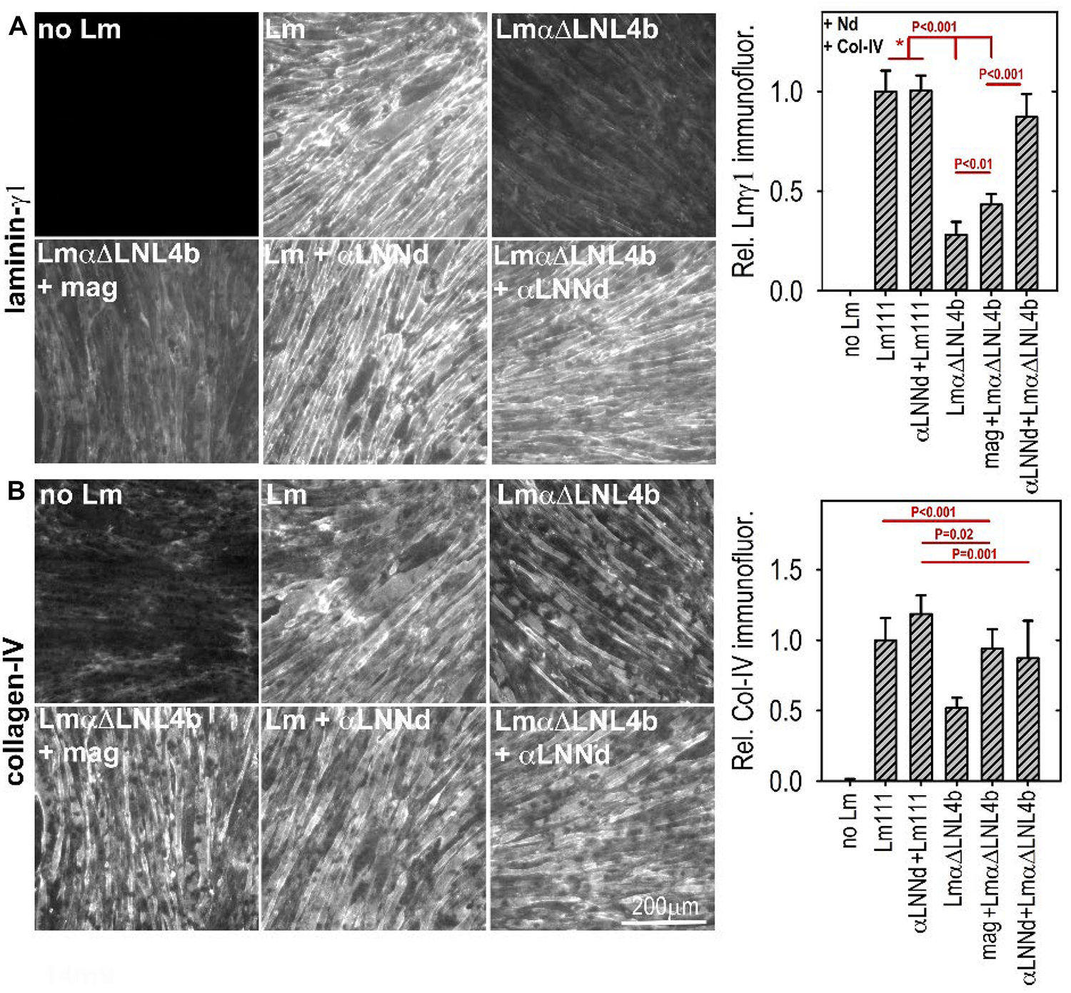 αLNNd was engineered from the Lmα1 and nidogen-1 subunits and initially used as a tool to dissect laminin polymerization (McKee et al., 2009). It consists of the Lmα1 LN and four adjacent LEa domains fused to the more distal G2 through G3 domains of nidogen-1. The G3 domain binds to the Lmγ1 LEb3 domain near the intersection of the short arms, the LN domain mediates polymerization by attaching to β1 and γ1 LN domains, and the G2 domain enables binding to collagen-IV and also perlecan. The intervening LE (EGF-like domains with 8 rather than 6 cysteines) between LN and G2 and EGF-like domains between G2 and G3 are spacers between the globular domains and hence between bound ligands and, in the case of LEa1-2, enable proper folding and secretion of the LN domain. The expected interactions of αLNNd were confirmed by biochemical characterizations that included direct binding assays, polymerization assays of αLNNd coupled to non-polymerizing versions of recombinant laminin-111, rotary shadow electron microscopy to visualize molecular organization, and cell surface BM assembly experiments on Schwann cells and myotubes (McKee et al., 2009, 2017). The solid phase binding assays revealed that αLNNd bound to immobilized laminin-111 with the same apparent dissociation constant as nidogen-1, that αLNNd bound to immobilized collagen-IV with a dissociation constant slightly greater than that of nidogen-1, and that αLNNd linked laminin to collagen-IV. αLNNd, when coupled to Lmα1ΔLN-L4b, a laminin with only two short arms, appeared as a three short arm laminin in Pt/C rotary shadowed replicas by electron microscopy (McKee et al., 2007). This complex was found to polymerize with a polymerization slope and critical concentration similar to that of wild-type (WT) Lm111, whereas the truncated laminin lacking αLNNd did not polymerize. αLNNd similarly enabled Lmα1ΔLN (which lacks only the αLN domain) to polymerize. The linker-laminin complexes assembled on SC and myotubes (Figure 5) surfaces at levels comparable to wild-type laminin-111 (similar to Lm211), and well-above the levels seen with the non-polymerizing laminins alone (McKee et al., 2009, 2017).