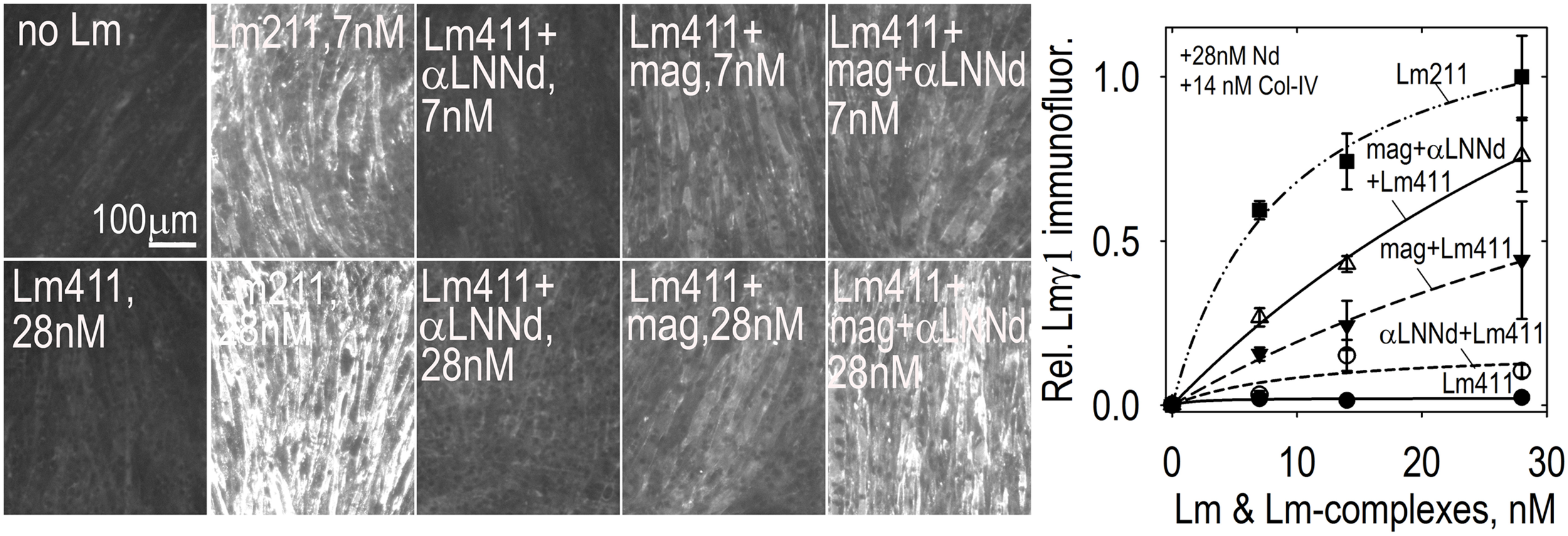 Lm411-linker assembly on myotubes. Lm 411 was incubated without or with bound linker protein(s) at different concentrations in the presence of nidogen-1 (28 nM) and collagen-IV (14 nM). Accumulation on myotubes was assessed by Lmγ1-antibody immunofluorescence. Lm211 produced the highest level of laminin accumulation while Lm411 produced the lowest level. Each linker protein alone elevated Lm411 accumulation. The combined linker elevated accumulation to a level approaching that of Lm211 (Reinhard et al., 2017). An analysis of laminins in the dyW/dyW mice without and with miniagrin and miniagrin plus αLNNd transgenes revealed that transgene expression improved Lm411 levels and retention within matrix fractions in muscle (Reinhard et al., 2017).