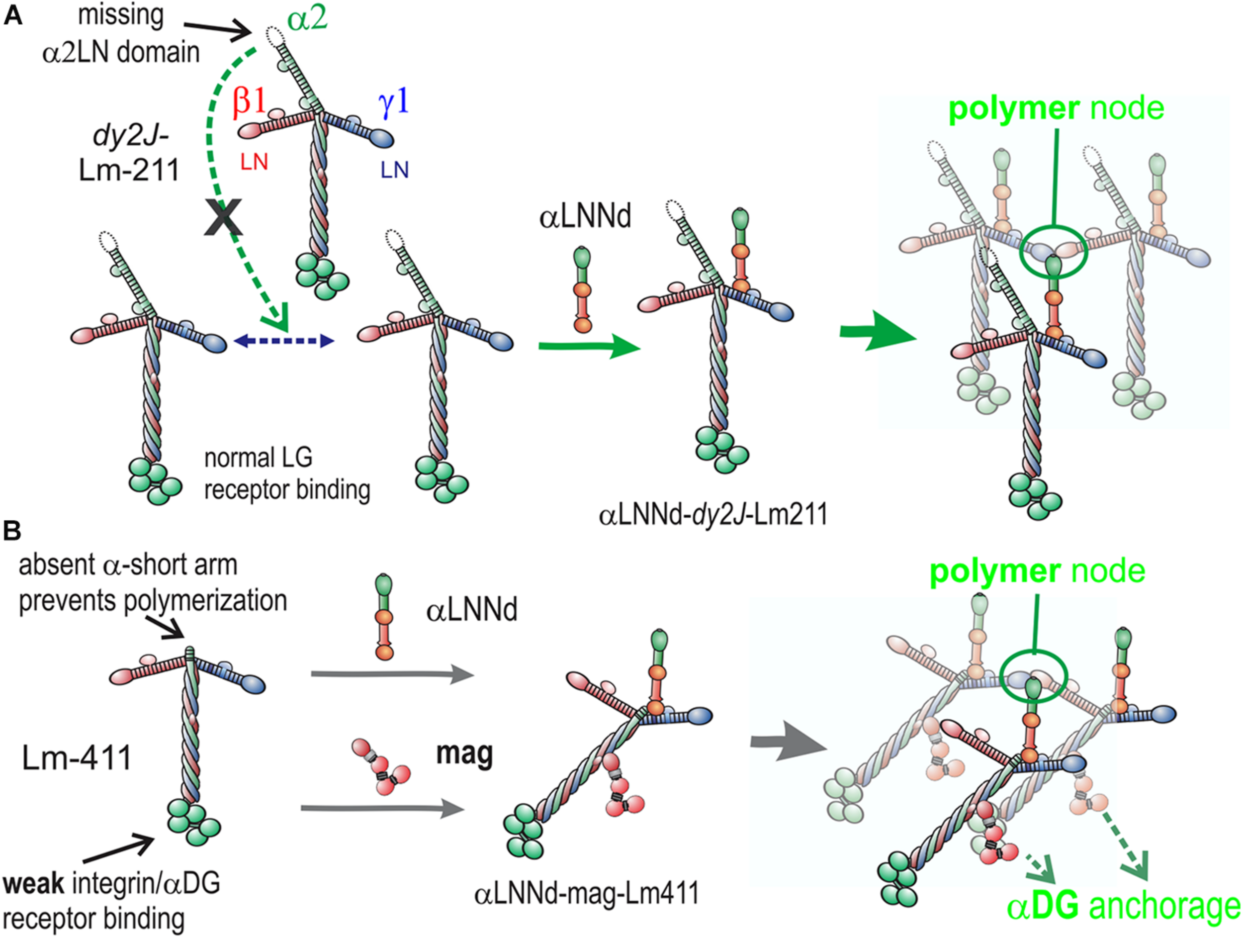 Model of linker protein modification of laminin interactions in models of ambulatory and non-ambulatory laminin α2-deficiency (Yurchenco et al., 2018). (A) In the dy2J/dy2J mouse, Lm211 is unable to polymerize as a result of in-frame deletion within the α2LN domain leading to its degradation (Colognato and Yurchenco, 1999). αLNNd binds to the nidogen-binding locus (replacing nidogen), thus “restoring” polymerization. (B) In the Lama2 null mice, the compensatory Lm411 neither polymerizes nor binds to the key αDG receptor of muscle. Miniagrin binds to the coiled-coil (replacing native agrin) while αLNNd binds to the nidogen-binding locus. The combination of linker proteins enables polymerization and greatly enhances cytoskeletal anchorage such that the modified laminin behaves in a manner similar to Lm211.