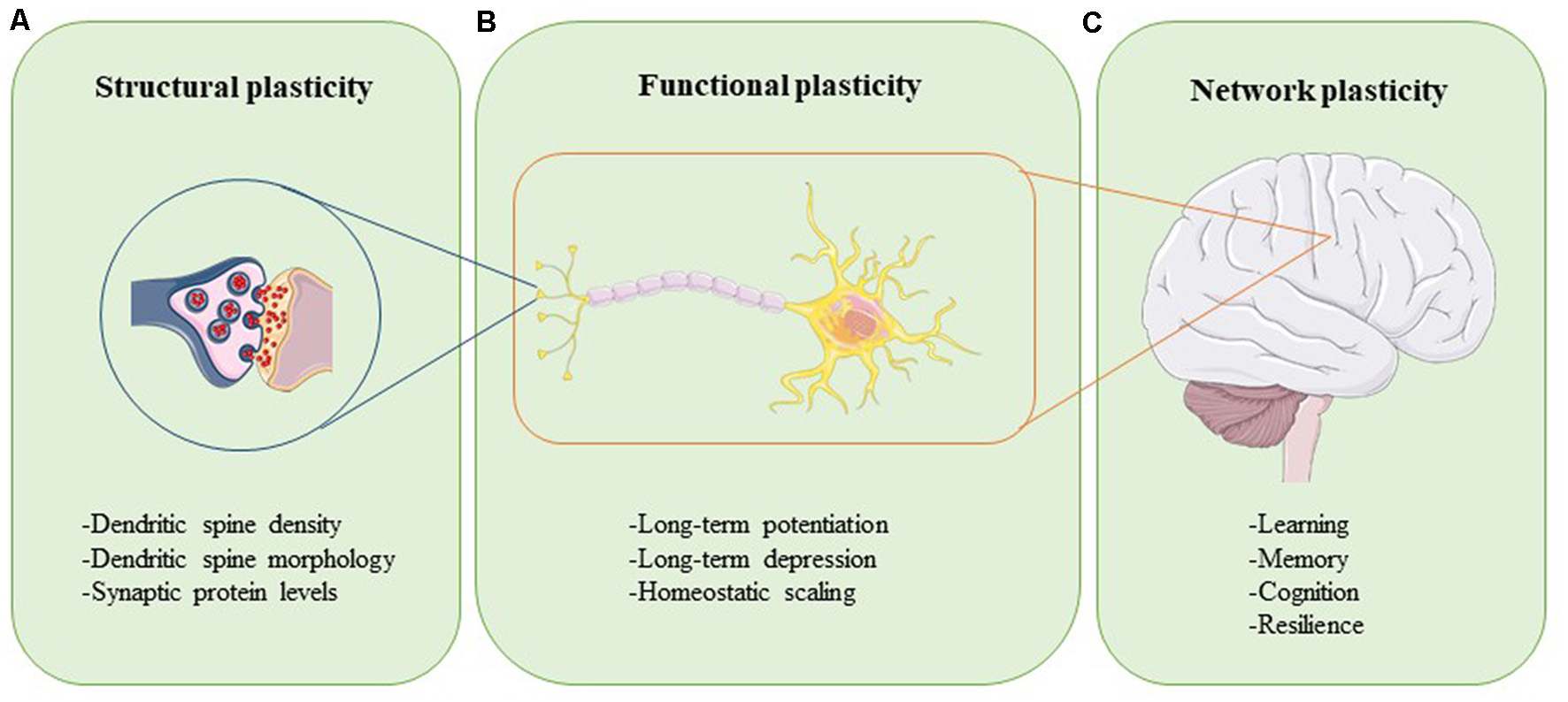 Neuroplasticity can be assessed at different levels. Structural plasticity refers to the morphological changes that occur at the synapse, such as altered dendritic spine density, dendritic spine shape, and synaptic protein profiles (A). Functional plasticity affects neuronal circuit regulation and includes processes such as long-term potentiation (LTP), long-term depression (LTD), and homeostatic scaling (B). At the organ level, network plasticity modulates learning, memory, cognition, and resilience (C). Proper function and careful integration of all levels of plasticity are required for healthy brain function.