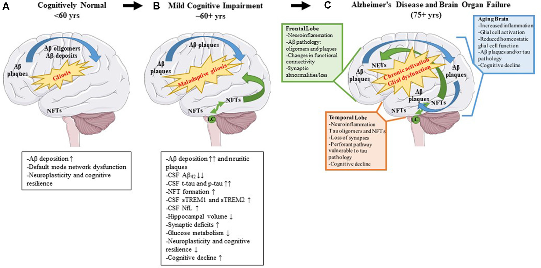 Pathological changes and biomarker alterations observed in the development of Alzheimer’s disease (AD). Moving left to right: schematic depicting brain alterations in a cognitively normal individual (A), in an mild cognitive impairment (MCI) individual (B), and in an end-stage AD patient (C). Amyloid β (Aβ) pathology begins in the frontal cortex and spreads throughout the brain (blue arrows). Neurofibrillary tangle (NFT) pathology begins in the medial temporal cortex and locus coeruleus and spreads to the rest of the brain (green arrows). Gliosis increases with age, and the onset of the disease leads to maladaptive gliosis and eventual chronic glial activation and dysfunction. Biomarker alterations corresponding to each stage are listed under (A,B) in black boxes. Abnormal changes in the frontal and temporal lobes as well as changes observed in an aged brain are listed in (C) in green, orange, and blue boxes, respectively.