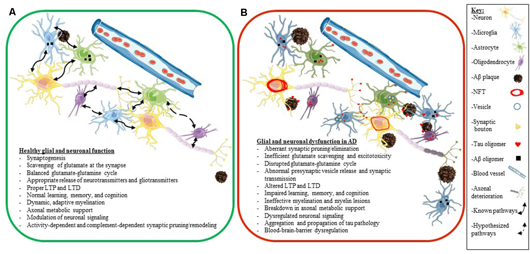 Glial and neuronal function and plasticity are dysregulated in AD. Schematics depicting healthy glial and neuronal function (A) compared to AD-induced glial and neuronal dysfunction (B). Normal communication and support processes occur between neurons, astrocytes, microglia, and oligodendrocytes even in the presence of Aβ plaques and oligomers (A). In AD, healthy communication and function break down between neurons, astrocytes, microglia, and oligodendrocytes (B). Astrocytes and microglia take up tau, Aβ, and synaptic boutons; tau oligomers spread across synapses and travel between different cell types (neurons, astrocytes, microglia, and oligodendrocytes); neurons develop NFT deposits, and Aβ plaques convert to neuritic plaques and cause the death of neurites (B). Listed below the schematics are dysregulated processes seen in a normally functioning brain (A) compared to an AD brain (B). The key for the schematics is located on the right side of the figure.
