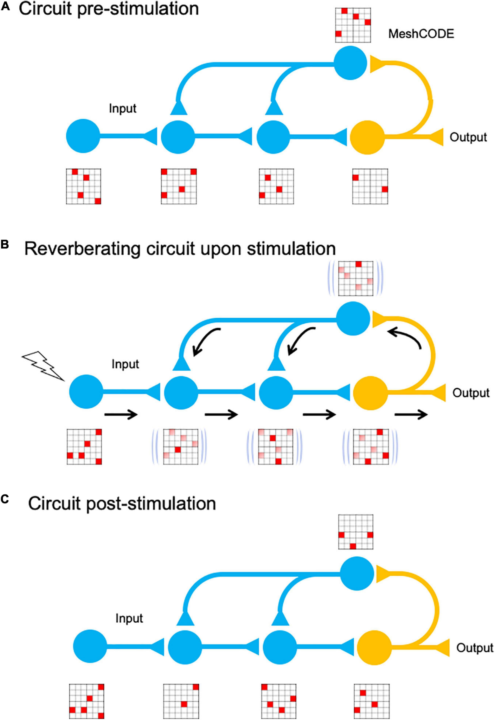 MeshCODE updating. Cartoon of a simplified neural circuit comprised of an input neuron, which inputs into a three-neuron circuit (blue) that is wired up to an output neuron (orange). A schematic of a MeshCODE is shown for each neuron (for clarity just a 6 × 6 array is shown). White, 0, Red, 1. (A) At rest, the MeshCODEs throughout the circuit are in a specific pattern of 1s and 0s. (B) Stimuli input into the system perturbing the equilibrium state across the entire circuit. The calculation occurs as the cytoskeletal alterations cause changes to the coding of the system. The relevant output from the circuit is transmitted. (C) Following the input, and the resulting calculation, the MeshCODEs in that circuit are altered in a way that encodes information.