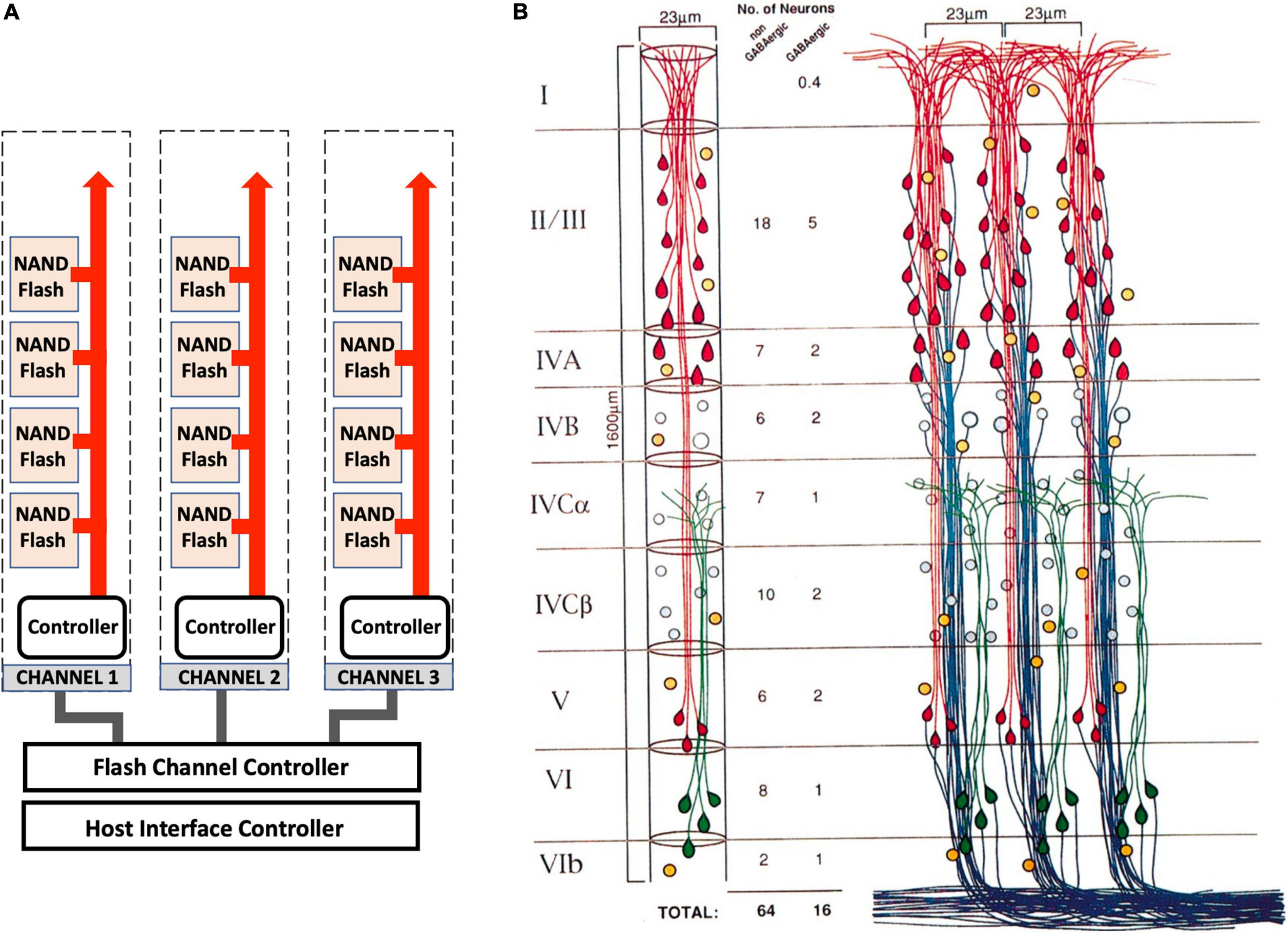 Architectural similarities of memory storage in silico and in vivo. (A) A high-capacity SSD storage device is incredibly complicated, but its general architecture is arranged into a logical repeating structure of pages, arranged into blocks that are arranged into memory modules (NAND Flash). These hierarchical structures are linked to channels that connect each memory module to a memory controller that controls the data coming in and out of the drive and directs current to the relevant pages and transistors for data read-write. (B) The cortex shares a similar logical architecture. Three cortical columns are shown that are equivalent to the SSD channels. These columns contain layers (I–VI) that are comprised of minicolumns (the memory modules equivalent to the NAND Flash), which are comprised of circuits of pyramidal neurons (the blocks) that contain tens of thousands of MeshCODEs in the synapses and dendritic spines (the pages). Each column is linked with read and write channels back to the hippocampus. Adapted with permission from Peters and Sethares (1996).