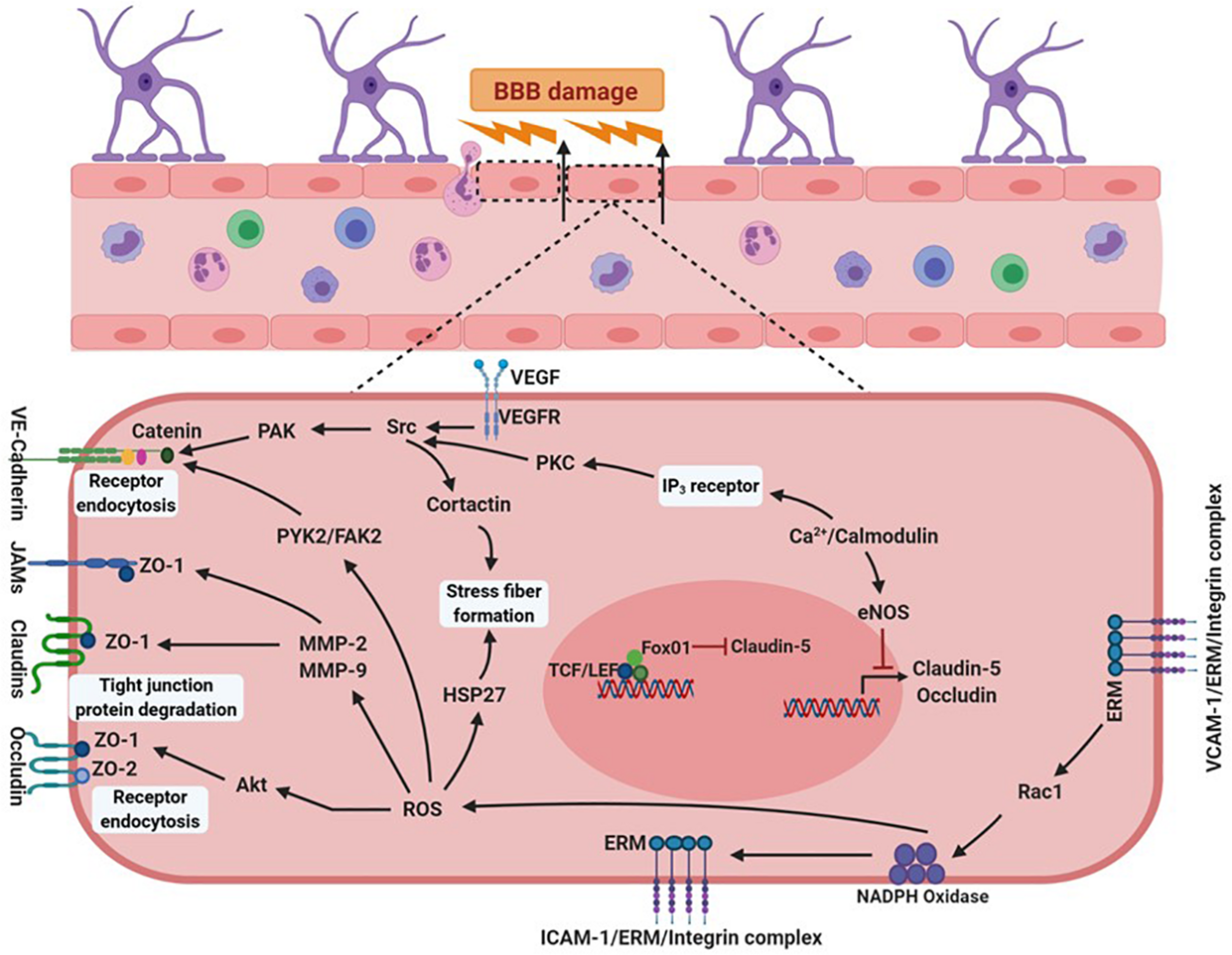 Vascular endothelial signaling after brain injury. In a brain inflicted with traumatic injury, inflammatory conditions stimulate signaling pathways in the cells of NVU. Cytokines TNFα and IL-1 released from blood cells activate receptors present on the vascular lumen near the sites of inflammation. These cytokines upregulate expression of selectins, chemokines, and integrin ligands like ICAM-1 and VCAM-1 on the surface of the endothelial cells, causing increased production of NADPH oxidase. Elevations in NADPH oxidase-mediated release of ROS degrades tight and gap junction proteins such as occludins, claudins and connexins, by generating excessive amounts of Akt and MMPs (MMP-2 and MMP-9). Oxidative stress enhances the production of FAK2, that damages adhesion molecules, cadherins. Alternatively, increased calcium inside the cell activates IP3 receptors resulting in increased PKC production, which in turn generates PAK via phosphorylation of Src kinase. PAK is also activated by Src phosphorylation via the activation of VEGF receptors. These events collectively damage cadherins compromising integrity of cellular junctions. Elevations in calcium levels also produces eNOS, which blocks claudin-5 and occluding transcription. These events cause BBB breakdown, allowing increased migration of peripheral immune cells into the central nervous system. NVU, neurovascular unit; ICAM-1, intercellular adhesion molecule 1; VCAM-1, vascular cell adhesion protein 1; MMPs, matrix metallopeptidase; FAK2, focal adhesion kinase 2. Figure created with BioRender.com and R&D Systems.