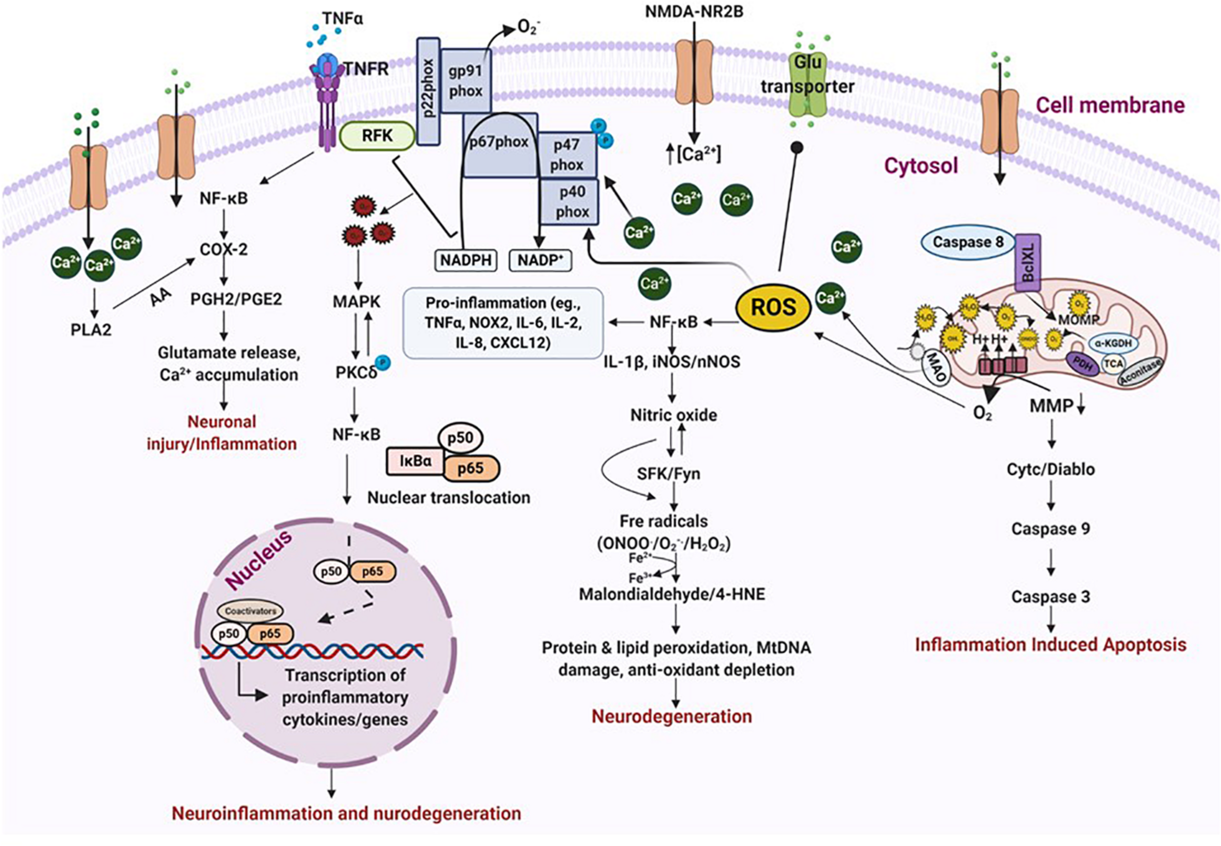 Oxidative stress is a biochemical state when an excessive production of ROS/RNS cause damage to the cell membranes and proteins, as well as to cellular and mitochondrial genomes (Cardenas-Rodriguez et al., 2013). Majority of oxygen and nitrogen-centered free radicals are generated from interactions between NO and molecular oxygen (O2). NO is produced from the substrate L-arginine, with the help of a co-factor NADPH and O2, and enzyme nitric oxide synthase (NOS). In the cytoplasmic membrane, superoxides are primarily generated by NADPH oxidase, after an electron transfer from NADPH to O2. These superoxides are also generated by the action of O2 on xanthine oxidase. Under normal physiological conditions, superoxides are converted into H2O2 by the action of superoxide dismutase, which is then broken down into water and oxygen (with the help of catalase and glutathione peroxidase). Degradation of superoxide dismutase promotes enhanced production of highly reactive peroxynitrites (ONOO–), a powerful oxidizing agent, which results in increased ROS production, DNA, proteins and lipids oxidation and loss of ion channel dysfunction (Halliwell, 1999; Puttachary et al., 2015). Increased superoxide in a cell cause oxidative burst promoting oxidative damage by exacerbating inflammation, enhancing redox signaling and proinflammatory gene regulation (Agledal et al., 2010). Moreover, impairment of catalase and peroxides promote formation of hypochlorous acid from H2O2 by reacting with Cl–, NO2– and phenols. This causes cell death by destabilizing calcium homeostasis. Alternatively, H2O2 can also undergo Fenton and Haber–Weiss reaction to form OH radicals (a harmful free radical of oxygen with high reactivity and a short half-life) which results in proteins and lipid peroxidation, mitochondrial DNA damage and depletion of antioxidant enzymes (Bae et al., 2011; Puttachary et al., 2015).