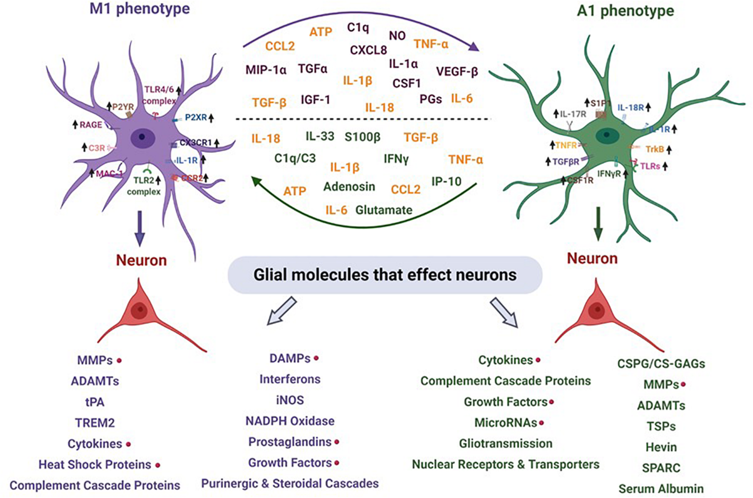 Comprised BBB integrity and neuro-glia crosstalk in PTE. Proinflammatory factors released by damaged neurons and glial cells initiate a vicious cycle of inflammation in the brain. (1) Brain injury results in an early activation of microglia and stimulate production of cytokines and expression of DAMPs associated receptors on their surface, leading to neuronal excitability. (2) Increased cellular hyperexcitability due to molecules released by reactive glia and neurons promote, (3) blood cell chemotaxis and transmigration into the brain. Disruption in BBB leads to brain infiltration of immune cells from the blood releasing (4) proinflammatory factors and promoting excitotoxicity. (5) Later, activated microglia release signals that bind to the receptors on astrocytes. (6) Serum albumin induced activation of astrocytes impairs potassium channel and glutamate transporter. In addition, activated astrocytes release proinflammatory factors which exacerbates neuronal hyperexcitability. (7) These factors collectively or on their own cause neurodegeneration. Cytokine mediated crosstalk between astrocyte-microglia and neuro-glia induces hyperexcitability and neuronal cell death. In contrast, molecules derived from neurons, such as HSP60, HMGB1, CD14, CX3CL1, and ATP, cause microglia activation leading to excitotoxicity. Monocytes and leukocytes also release cytokines at this point. This creates an activation cycle which causes release of additional inflammatory molecules triggering cytokine storm in the brain. Discharge of molecules like MHCII, complementary proteins, proinflammatory interleukins, iNOS, transcription factors and microRNAs by macrophages, cause excitotoxicity in neurons. These molecules promote neurodegeneration and initiate neuroinflammatory pathways lowering the seizure threshold. HSP60, heat shock proteins; HMGB1, high mobility group box 1; CD14, cluster of differentiation 14; CX3CL1, chemokine (C-X3-C motif) ligand 1; ATP, adenosine 5′-triphosphate; iNOS, inducible nitric oxide synthase. Figure created with BioRender.com (2020). Retrieved from https://app.biorender.com/biorender-templates.