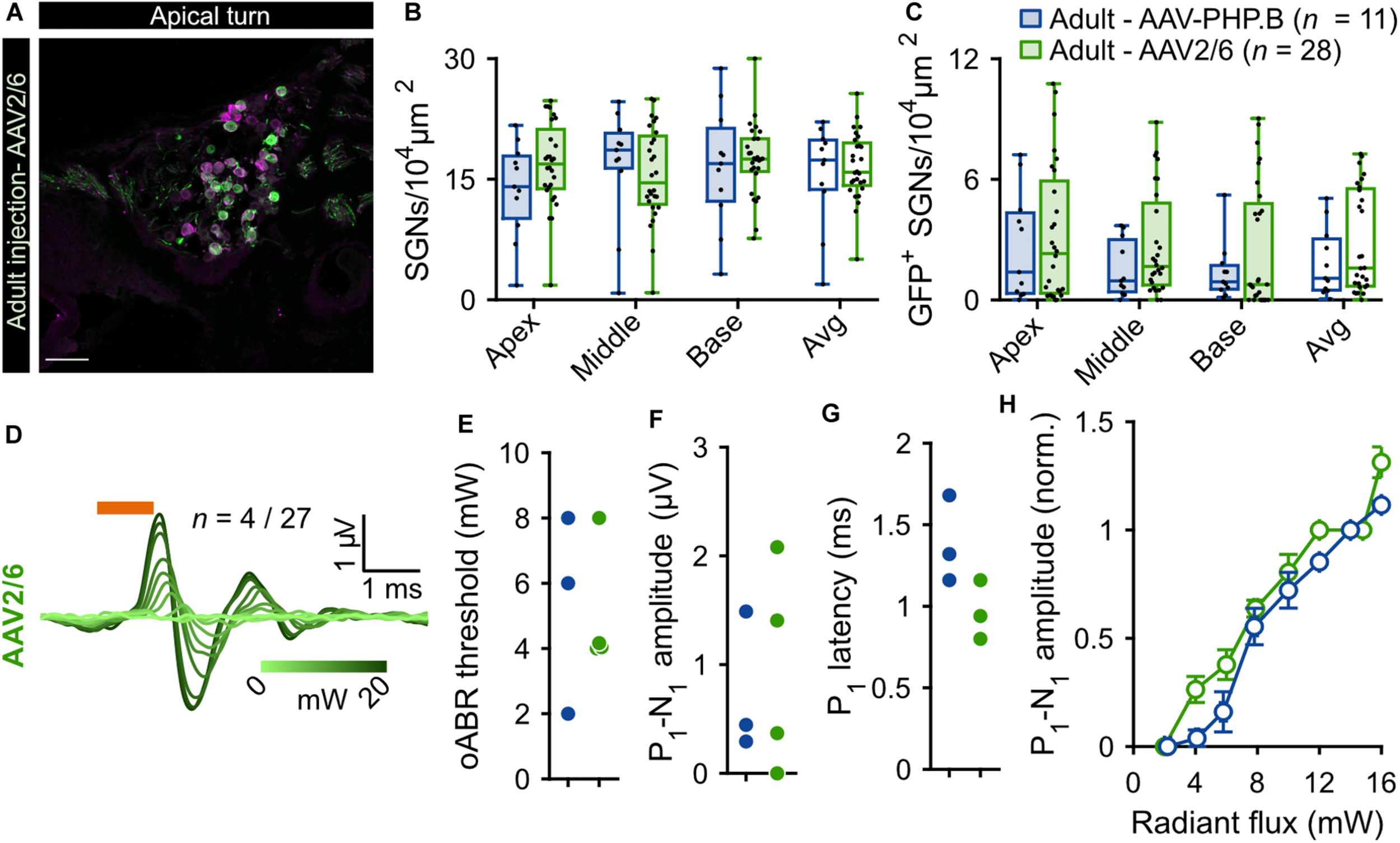 Comparison of f-Chrimson expression in SGNs and oABRs between AAV-PHP.B and AAV2/6 cochlear injections in adult gerbils. (A) Representative maximum projection of confocal images obtained from immunolabeled mid-modiolar cochlear cryosections (cochlear apical turn) following adult pressure cochlear injection of AAV2/6-f-Chrimson. GFP (green) marks transduced SGNs and calretinin (magenta) was used as a generic SGN marker (scale bar = 50 μm). (B,C) SGN density (B) and GFP-positive SGNs density (C) measured at the cochlear apical, middle and basal turn and average of the 3 turns for AAV-PHP.B (n = 11) and AAV2/6 (n = 28) f-Chrimson injected cochleae. Box plots show minimum, 25th percentile, median, 75th percentile, and maximum with individual data point overlaid. (D) Largest oABR recorded following AAV2/6 adult injected cochleae (λ = 594 nm, pulse duration = 1 ms, repetition rate = 10 Hz). oABRs could be recorded in 4 out of 27 gerbils. The color scale encodes the radiant flux. (E–G) oABR threshold (E), P1-N1 amplitude (at 14 mW, F), and P1 latency (at 14 mW, G) measured from PHP.P (blue) and AAV2/6 (green) adult injected gerbils. (H) P1-N1 amplitude oABR growth function of AAV-PHP.B (blue) and AAV2/6 (green) injected gerbils. Amplitude were normalized relative to the amplitude at 14 mW. Average ± SEM. For all panels AAV-PHP.B data (blue) are replotted from Figure 1.