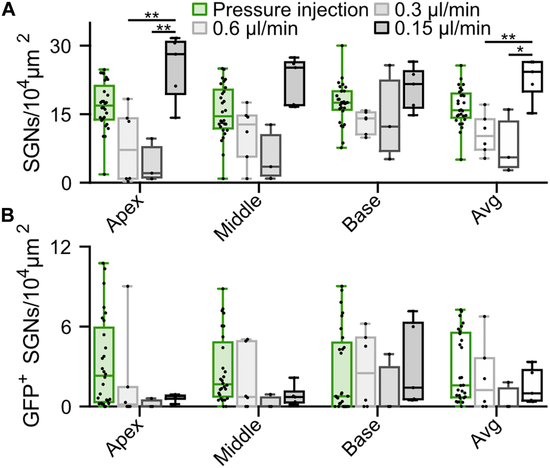 Finally, we showed that using a slow injection speed (≤0.15 μl/min) via a micropump allowed to preserve the SGN density compared to a pressure injection, for which a fraction of neurons was lost (Figure 3 and Wrobel et al., 2018). We propose that loss of SGNs results from cell death upon mechanical stress causing an immediate structural breakdown (Galluzzi et al., 2015) but cannot rule out other reasons. Nonetheless, using slow injection, only a small proportion of SGNs were transduced. These results suggest that a slow injection may be favorable to improve cell survival once efficient transduction is established. For example, future work could combine a slow injection with an additional cochlear vent for efficient exposure of the spiral ganglion to the virus suspension. This might increase the transduction rate while securing SGN survival. Approaches reported in the literature mostly aimed at administration to the perilymphatic space, combining, for example, round window injection with posterior semicircular canal fenestration (PSCC) or injection from the PSCC to the round window (Yoshimura et al., 2018; Talaei et al., 2019).