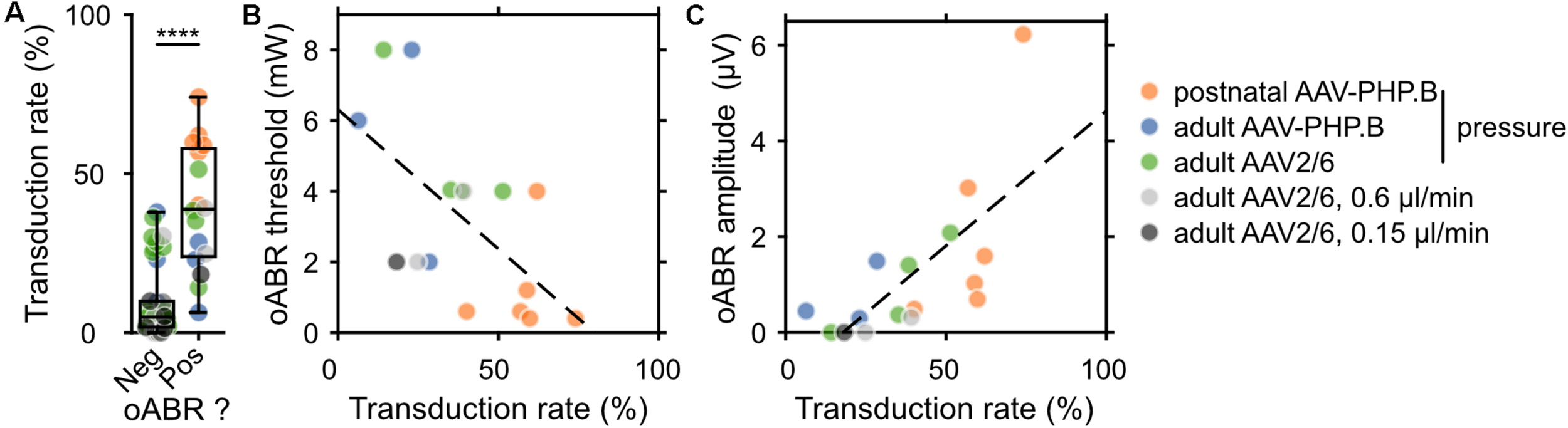 Correlating the rate of SGN transduction to f-Chrimson-mediated oABRs. (A) Transduction rate (defined as the ratio between the GFP+ SGN density and the SGN density) for gerbils lacking (Neg) or showing (Pos) an oABR. Wilcoxon rank sum test (****p ≤ 1 × 10–4). (B,C) Relationship between oABR threshold (B), amplitude (C) and the transduction rate (TR). Dashed lines are fitted using linear models: (B) y (in mW) = –7.88 * TR + 6.3 (linear correlation test: r = –0.61, p = 0.011); (C) y (in μV) = 5.64 * TR – 1 (linear correlation test: r = 0.70, p = 0.0027). The color code for the different injection conditions is represented on the right of the figure.