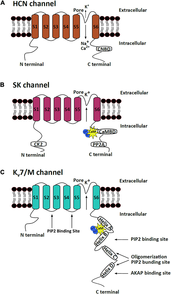 mAHP channel structures. The three mAHP channel subunits have a similar basic structure, which consist of six transmembrane segments, but significant heterogeneity is observed at the N and C termini. (A) HCN channels open in response to hyperpolarization and conduct a net inward current through the influx of Na+ and Ca+ and efflux of K+. The CNBD at the C terminus serves as the binding site for cAMP or cGMP, which regulates HCN channel activity. (B) SK channels are calcium-dependent potassium-conducting channels regulated by bound protein kinases and phosphatases at the N and C termini. (C) Kv7/M channels are voltage-sensitive potassium channels that are regulated by PIP2 and several protein kinases that bind to the C terminus of the protein.