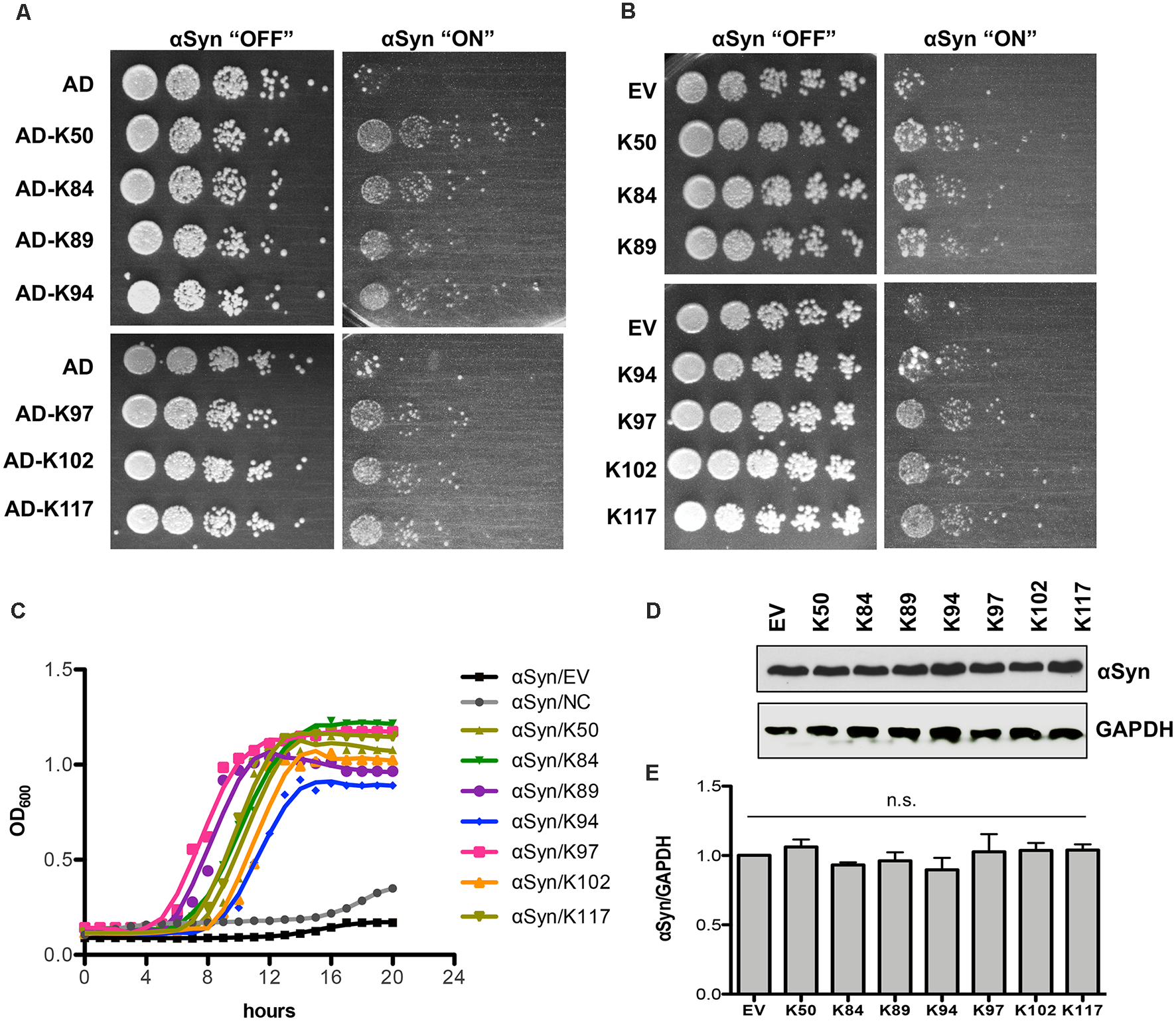 Expression of seven peptide constructs reduces αSyn-induced growth inhibition. (A) The yeast strain that harbors three copies of GAL1-driven αSyn-GFP-encoding gene (inducible “high-tox” strain RH3468) was transformed with the plasmid constructs, isolated from the screen. The Y2H plasmids contain the peptide-encoding sequence, fused to the B42-activation domain (AD). Yeast cells were spotted in 10-fold dilution on SC-Leu-Ura selective plates containing glucose (control: αSyn “OFF”) or galactose (αSyn “ON”) for induction of GAL1 promoter. Plasmid with AD was used as a control. Images of the plates were captured on the third day. (B) The peptide-encoding sequences were re-cloned without the N-terminal activation domain and driven by the GPD promoter. The yeast high-tox strain was transformed with the corresponding plasmids and spotting assays were performed. Empty vector (EV) was used as a control. (C) Growth analyses of yeast cells from (B) in galactose-containing medium for 20 h. (D) Immunoblotting analysis of protein crude extracts of yeast cells from (B) after 6 h induction in galactose-containing medium with an anti-αSyn antibody. Anti-GAPDH antibody was used as a loading control. (E) Densitometric analysis of the immunodetection of αSyn-GFP, relative to the loading control GAPDH. n.s.: not significant, (n = 3).