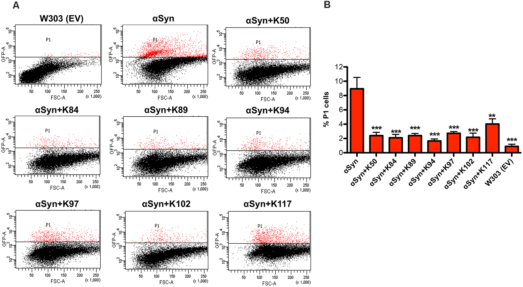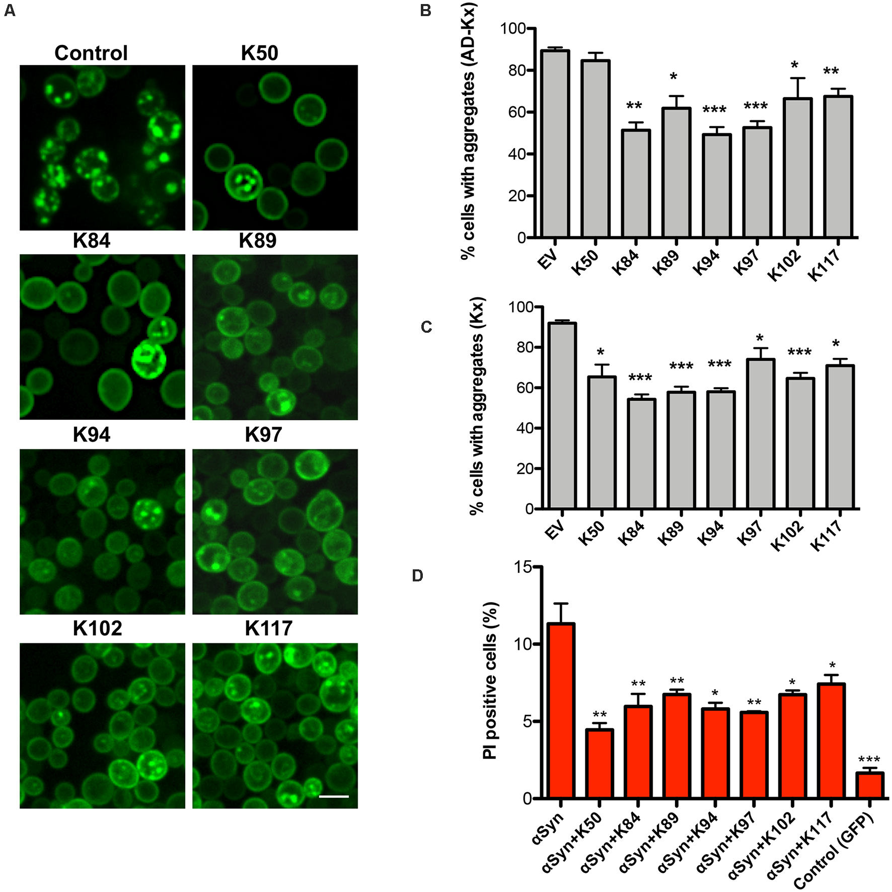 Yeast cells were grown in SC selective medium containing 2% raffinose at 30°C overnight and transferred to 2% galactose containing medium for induction of αSyn-GFP expression for 6 h. Fluorescent images were obtained with Zeiss Observer. Z1 microscope (Zeiss) equipped with a CSU-X1 A1 confocal scanner unit (YOKOGAWA), QuantEM:512SC digital camera (Photometrics), and SlideBook 6.0 software package (Intelligent Imaging Innovations). For quantification of aggregation, at least 200 cells were counted per strain and per experiment. The number of cells presenting inclusions was referred to the total number of cells counted. The values are the mean of at least four independent experiments.