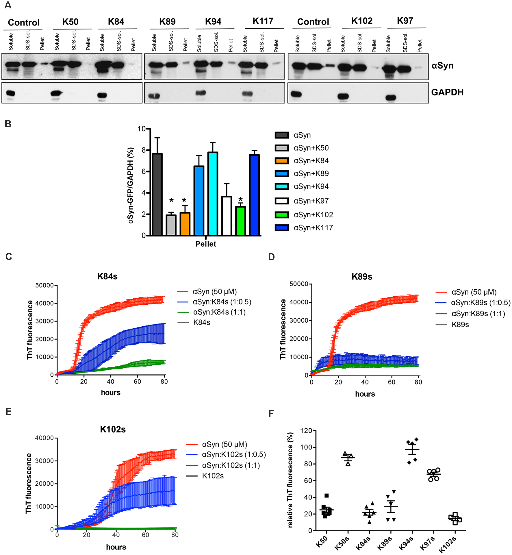 Human neuroglioma cells (H4) were maintained in Opti-MEM I Reduced Serum Medium (Life Technologies-Gibco) supplemented with 10% fetal bovine serum Gold (FBS) (PAA, Cölbe, Germany) at 37°C in an atmosphere of 5% CO2. The cells were plated in 12-well plates (Costar, Corning, New York) 24 h before transfection. H4 cells were transfected with FuGENE® six Transfection Reagent (Promega, Madison, WI) according to the manufacturer’s instructions with equal amounts of plasmids of SynT and synphilin-1 as previously described (McLean et al., 2001; Lázaro et al., 2014). Twenty-four hours after the transfections, the cells were treated with K84s or K102s peptides at a concentration of 1 μM. 2% Ethanol was used as vehicle control. After 24 h, the cells were subjected to immunocytochemistry to examine αSyn inclusion formation.
