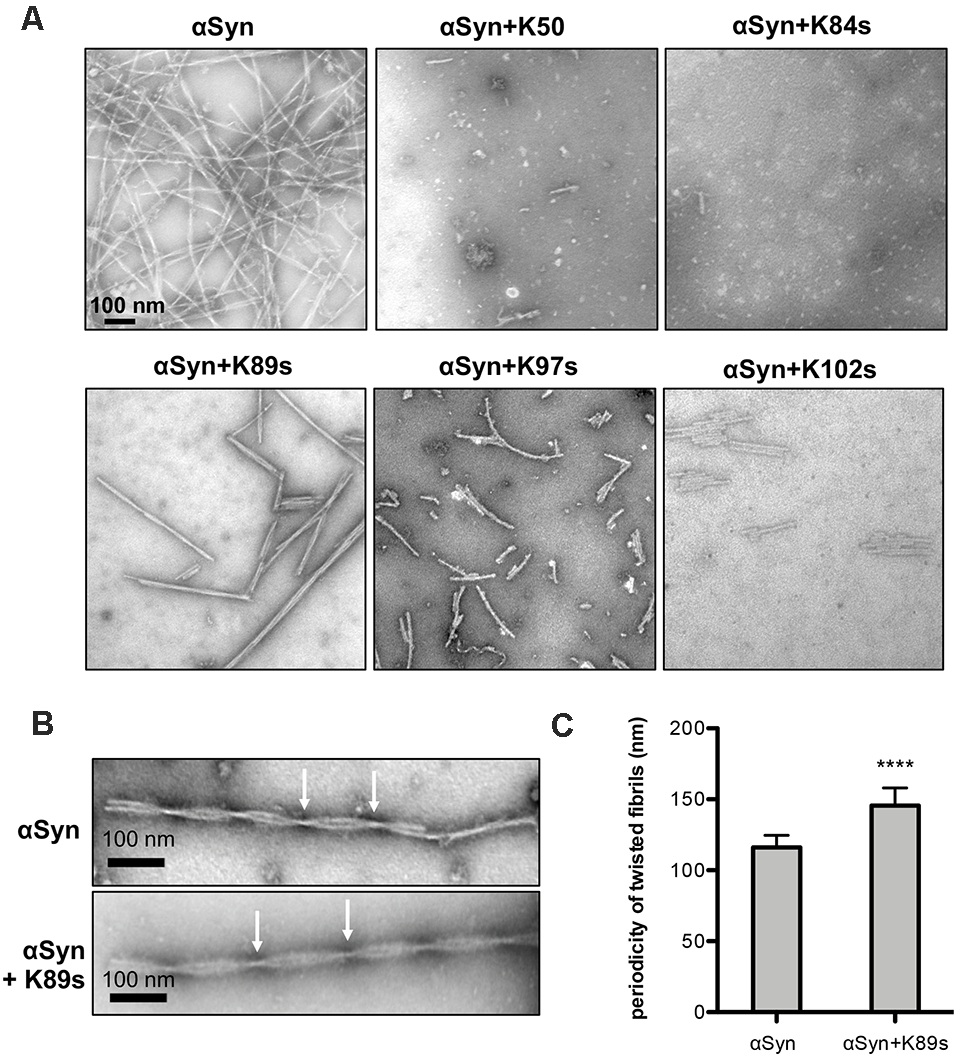 αSyn aggregation products were analyzed by negative staining and transmission electron microscopy according to Hoppert and Holzenburg (Hoppert and Holzenburg, 1998). In brief, a carbon film, evaporated onto a freshly cleaved mica surface, was partially floated off on the surface of a sample droplet for 1 min. The carbon/mica sandwich was removed, allowing the carbon film to fall back into its original position. For washing, the sandwich was transferred to a water drop and treated in the same way for 3 s to remove buffer constituents. Staining of the sample was performed by slowly immersing the sandwich into phosphotungstic acid (pH 7.0, 3%); the carbon film was completely floated off. Electron microscope grids (300 mesh, Plano, Wetzlar, Germany) were used to pick up the floating carbon film. After the grid was removed from the droplet, excess fluid was blotted by touching the grid vertically with a piece of filter paper. After drying, the negative stained samples were imaged using a Jeol EM 1011 transmission electron microscope (Jeol, Eching, Germany), equipped with a Gatan Orius 4 K camera (Gatan, Munich, Germany).
