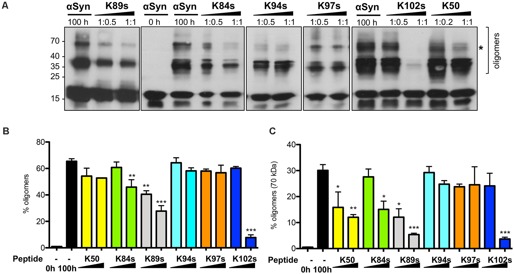 In this study, we used a peptide library and performed two high-throughput screens to isolate peptides that reduce αSyn-associated toxicity and aggregation. From a pool of one million candidates, we isolated seven candidates that specifically reduce the toxicity and aggregation of human αSyn in yeast. Two peptides with a length of 25 amino acids (K84s) and 19 amino acids (K102s) are effective inhibitors of αSyn oligomerization and fibrilization as determined with Thioflavin-T staining of amyloid fibrils, electron microscopy imaging, and biochemical analysis. Importantly, K84s reduced αSyn aggregation in the human cell.