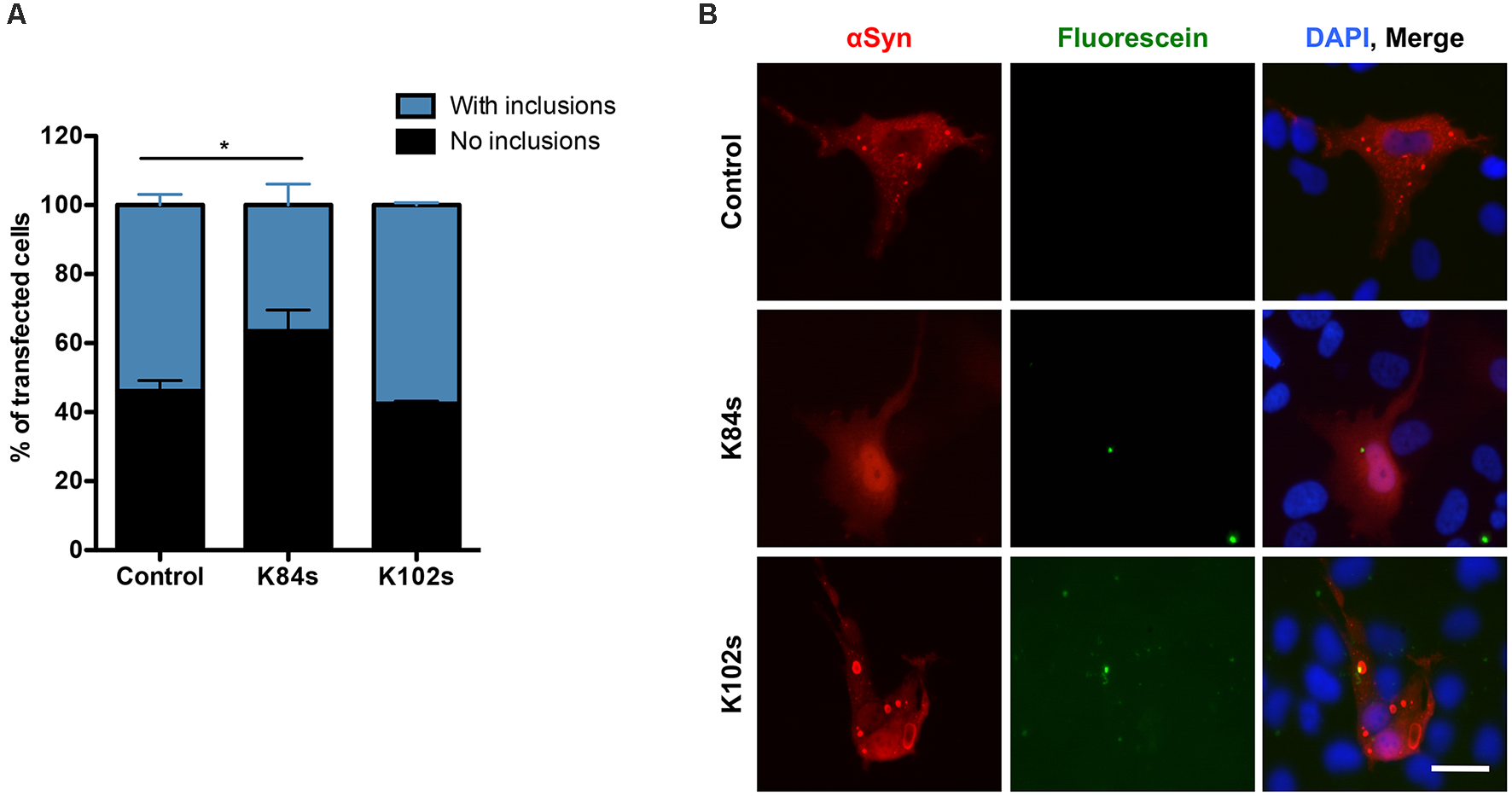 Transfected cells were scored based on the pattern of αSyn inclusions and classified as presented. Results were expressed as the percentage of the total number of transfected cells, and a minimum of 50 cells was counted per condition.