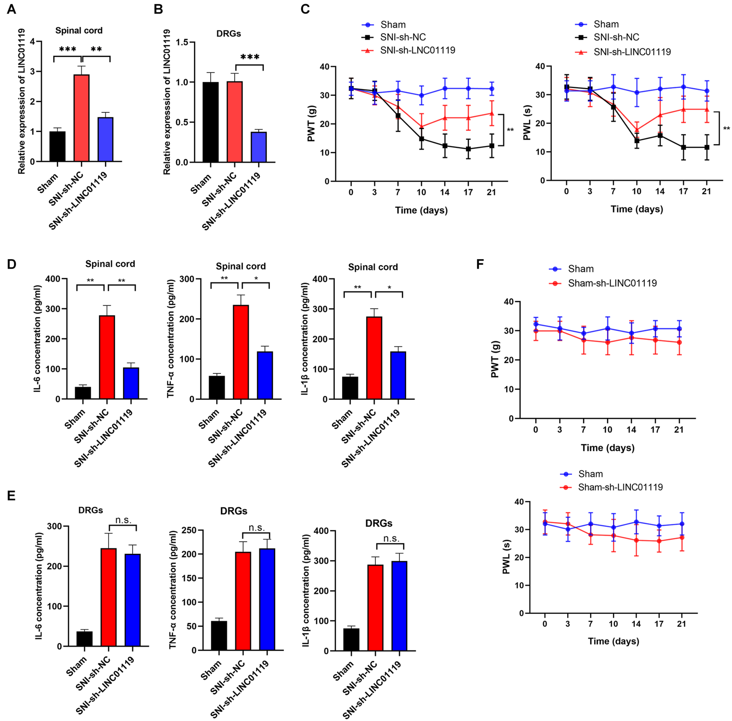 LINC01119 causes NP in rats undergoing SNI (A,B). LINC01119 was silenced in SNI rats after intrathecal injection of sh-LINC01119 vector in both spinal cord (A) and DRGs (B), **P < 0.01, ***P < 0.001, n = 3/group. (C) PWT (left) and PWL (right) were assessed in rats silenced with LINC01119, **P < 0.01, n = 5/group. (D,E) The concentrations of IL–6, TNF–α, and IL-1β in spinal cord (D) and DRGs tissues (E) of rats were detected by ELISA at day 14, *P < 0.05, **P < 0.01, n = 3/group. (F) PWL and PWT were not altered by LINC01119 knockdown in sham rats without SNI surgery, n = 5/group.