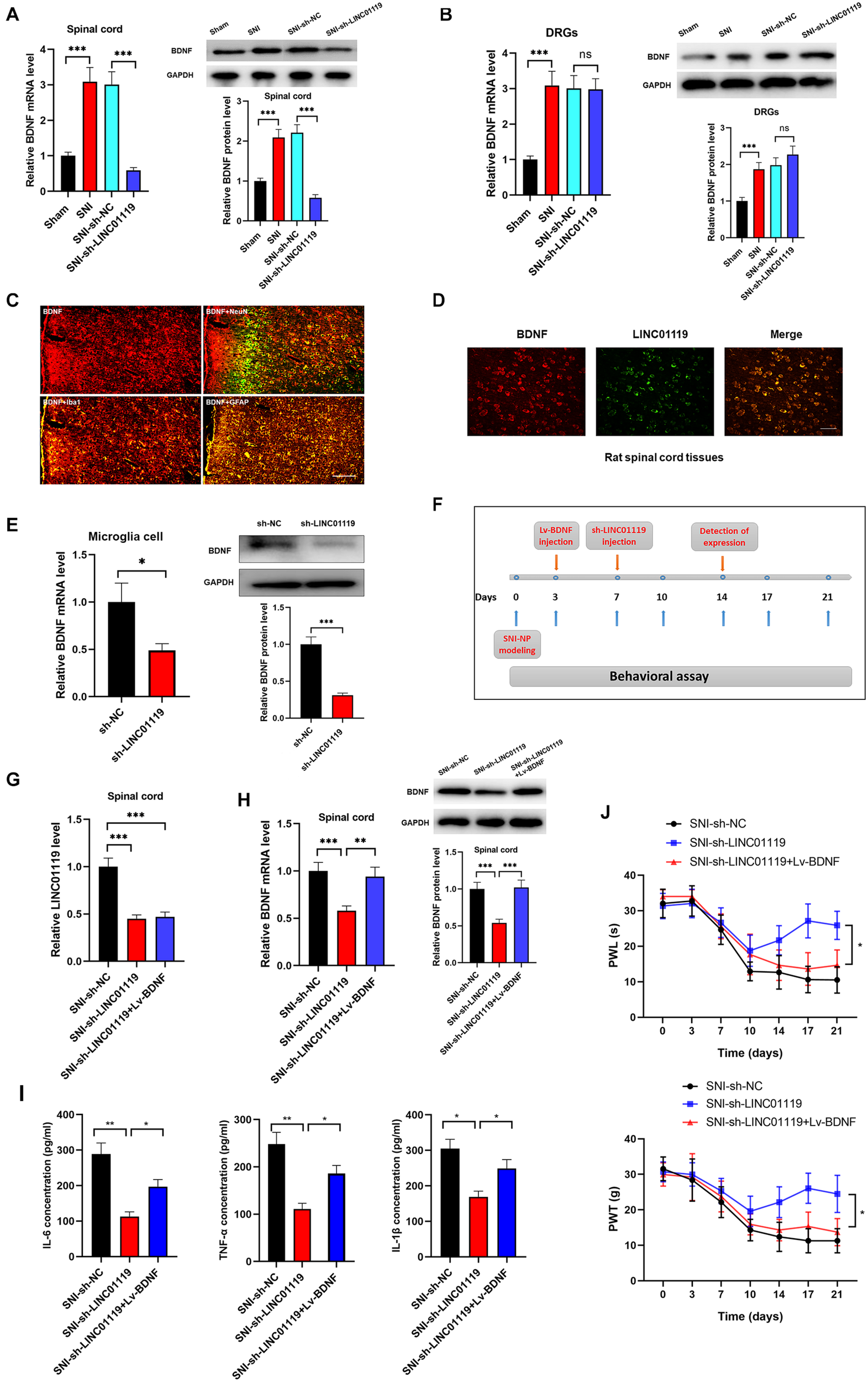 LINC01119 mediated NP progression via targeting BDNF. (A) BDNF mRNA (left panel) and protein (right panel) were upregulated in spinal cord tissue of SNI rats and downregulated by intrathecal injection of sh-LINC01119 in contrast to sham rats, ***P < 0.001, n = 3/group. (B) BDNF mRNA (left panel) and protein (right panel) were upregulated in DRGs of SNI rats, but was not regulated by sh-LINC01119, ***P < 0.001, n = 3/group. (C) Localization of BDNF in the spinal cord of SNI rats by double immunofluorescence of BDNF (red) with NeuN (marker of neuron, merged as yellow), lba1 (marker of microglia, merged as yellow), and GFAP (marker of astrocyte, merged as yellow). Scare bar = 100μm. (D) FISH analysis revealed a co-localization of LINC01119 and BDNF in spinal cord. Scare bar = 100μm. (E) BDNF was downregulated in microglia cells silenced with LINC01119 at both transcript and protein levels compared to control group, *P < 0.05, ***P < 0.001, n = 3/group. (F) The procedure of intrathecal injection of respective lentivirus vectors. (G,H) Expressions of LINC01119 (G) and BDNF (H) were shown in respective groups with different manipulations, **P < 0.01, ***P < 0.001, n = 3/group. (I) The concentrations of IL–6, TNF–α, and IL-1β in the spinal cord tissue of rats were downregulated by LINC01119 knockdown, however, this effect was abrogated by overexpression of BDNF, *P < 0.05, **P < 0.01, n = 3/group. (J) PWL and PWT was evaluated in SNI rats which were silenced of LINC01119 with or without BDNF overexpression, *P < 0.05, n = 5/group.