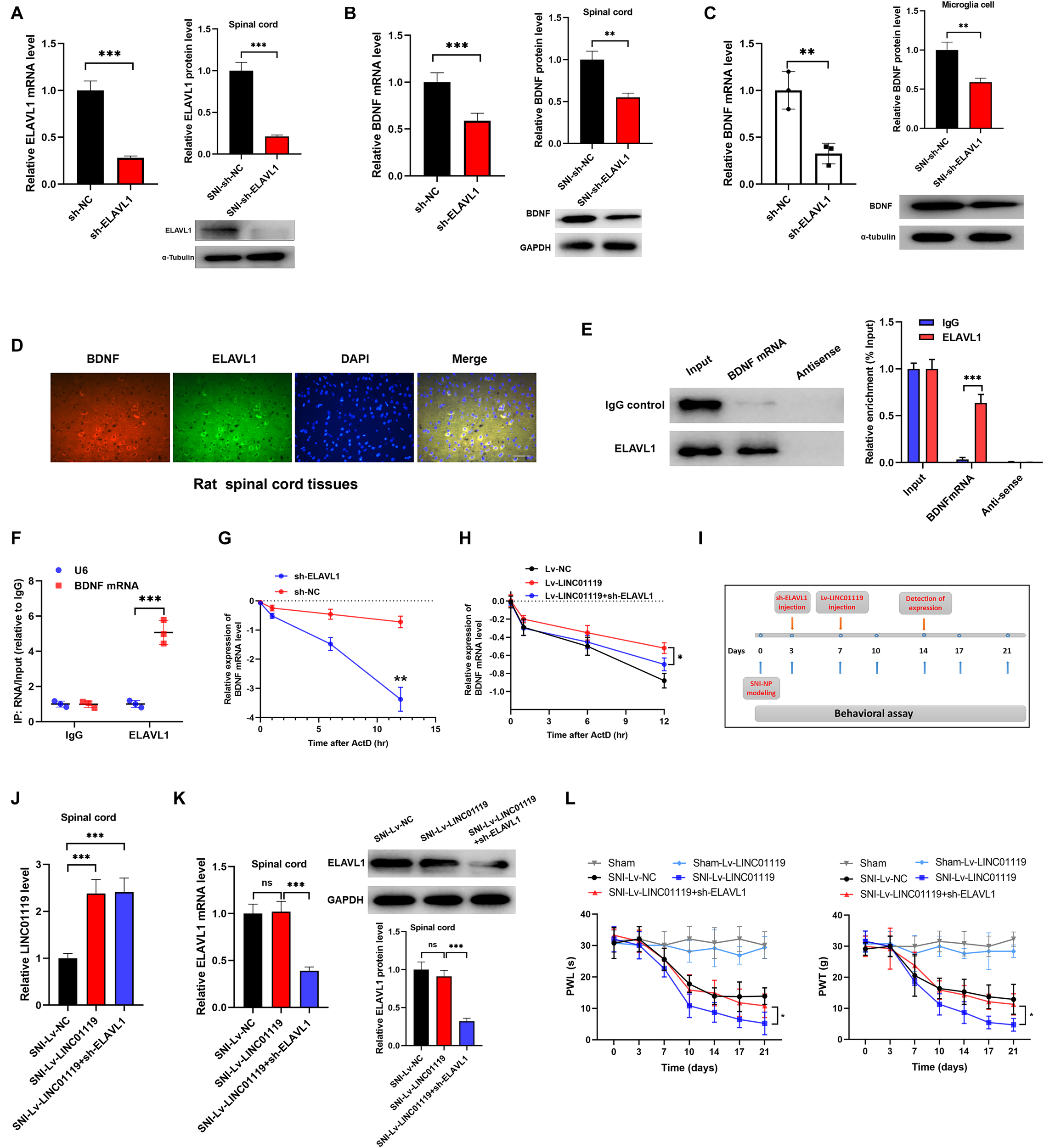 LINC01119-ELAVL1 complex stabilizes BDNF mRNA, thereby inducing NP in SNI rats. (A) ELAVL1 was silenced in spinal cord tissue of SNI rats at both transcript and protein levels, ***P < 0.001, n = 8/group. (B) BDNF was downregulated in spinal cord tissue of SNI rats silenced with ELAVL1 at both transcript and protein levels, ***P < 0.001, n = 3/group. (C) Knockdown of ELAVL1 induced inhibition of BDNF expression in rat microglial cells, **P < 0.01. (D) Immunofluorescence showed the co-expression of ELAVL1 and BDNF protein in spinal cord tissue of SNI rats. Scare bar = 100μm. (E) RNA pulldown assay showed that ELAVL1 protein was interacted with BDNF mRNA in spinal cord tissues, ***P < 0.001, n = 3/group. (F) RIP assay with ELAVL1 antibody in spinal cord showed a significantly higher enrichment of BDNF mRNA compared to U6, ***P < 0.001, n = 3/group. (G) The half-life of BDNF RNA was dramatically decreased in ELAVL1-silenced cells compared to that in control cells, ***P < 0.001. (H) Knockdown of ELAVL1 reversed the LINC01119-mediated RNA stability of BDNF in microglia cells, *P < 0.05. (I) The flow chart of manipulations of respective lentivirus vectors in SNI rats. (J,K) Expressions of LINC01119 (J) and ELAVL1 (K) in groups received respective manipulations, ***P < 0.001, n = 3/group. (L) PWL and PWT assays showed that knockdown of ELAVL1 abrogated LINC01119-induced NP behaviors, *P < 0.05, n = 5/group.