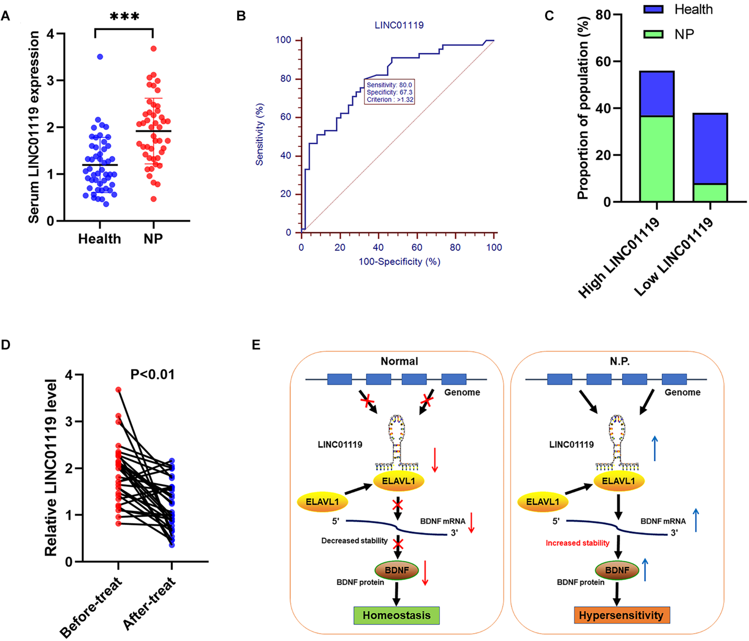 LINC01119 is a promising diagnostic marker for NP patients. (A) LINC01119 expression was detected in serum samples from 45 NP patients (PHN) and 49 healthy people by qRT-PCR, ∗∗∗P < 0.001. (B) ROC curve was established to evaluate the diagnostic performance of serum LINC01119 level. (C) The proportions of NP patients and healthy people in high or low-LINC01119 groups were shown. (D) Serum LINC01119 level were determined in 45 NP patients before and after treatment. (E) Schematic diagram of LINC01119 induces NP through regulating BDNF expression in an ELAVL1-dependent manner.