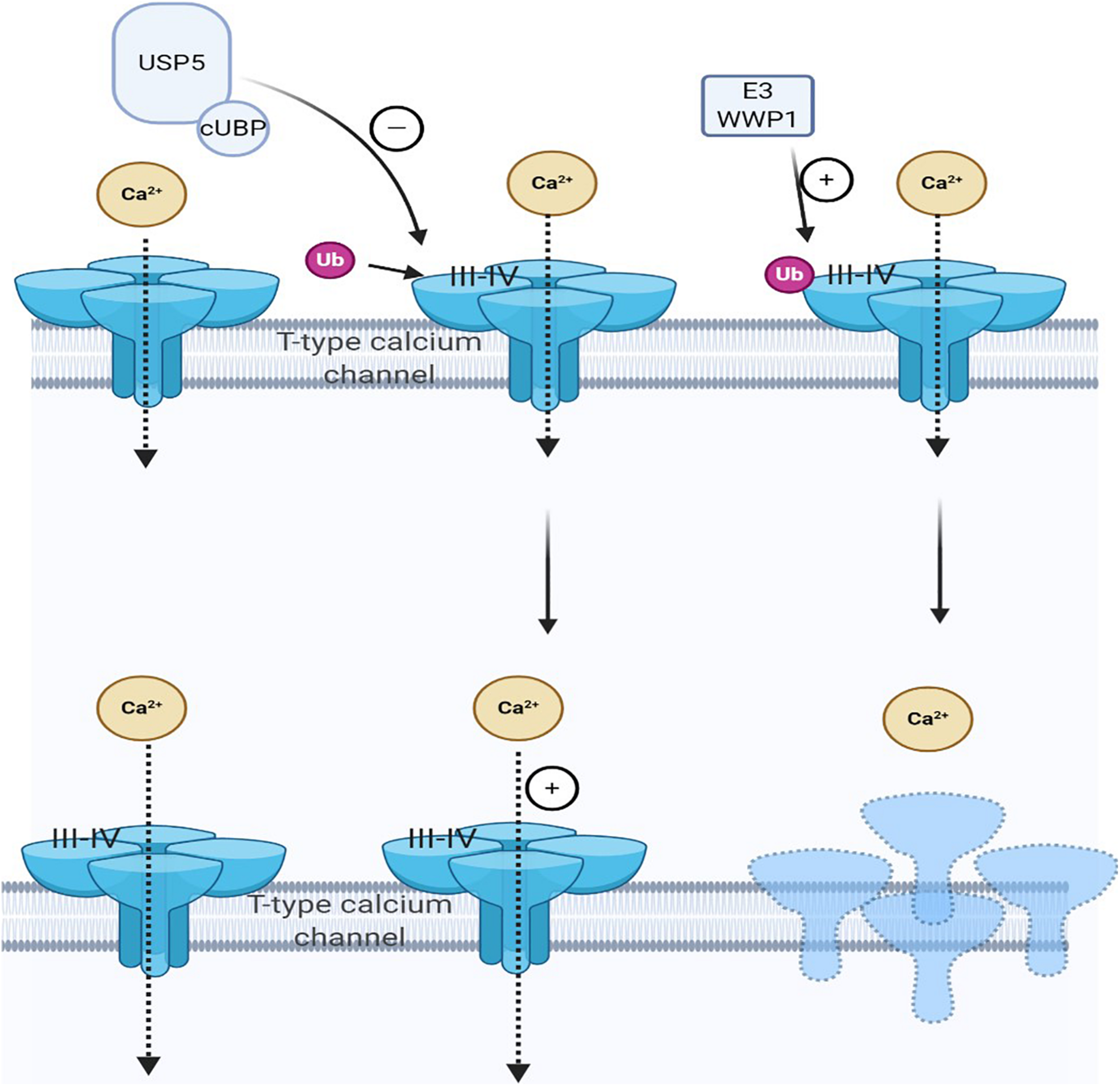 Cav3.2 channel ubiquitination status is regulated by the interaction of E3 ligase and ubiquitin-specific protease 5 (USP5). The ubiquitination state of Cav3.2 channel in the pain pathway is regulated by the interaction of USP5 and HECT E3 ligase HECT E3 ligase E3 ubiquitin-protein ligase 1 (WWP1), which can regulate the stability of the calcium channel protein in the plasma membrane. When pain occurs, USP5 is upregulated and its cUBP domain interacts with the III–IV junction of Cav3.2 T-type calcium channels. This can reduce the ubiquitination of Cav3.2 channels and upregulate Cav3.2 channels, making them more stable on the cell surface. WWP1 also binds to intracellular regions III–IV in the Cav3.2 t-channel junction region and modifies specific lysine residues in this region.