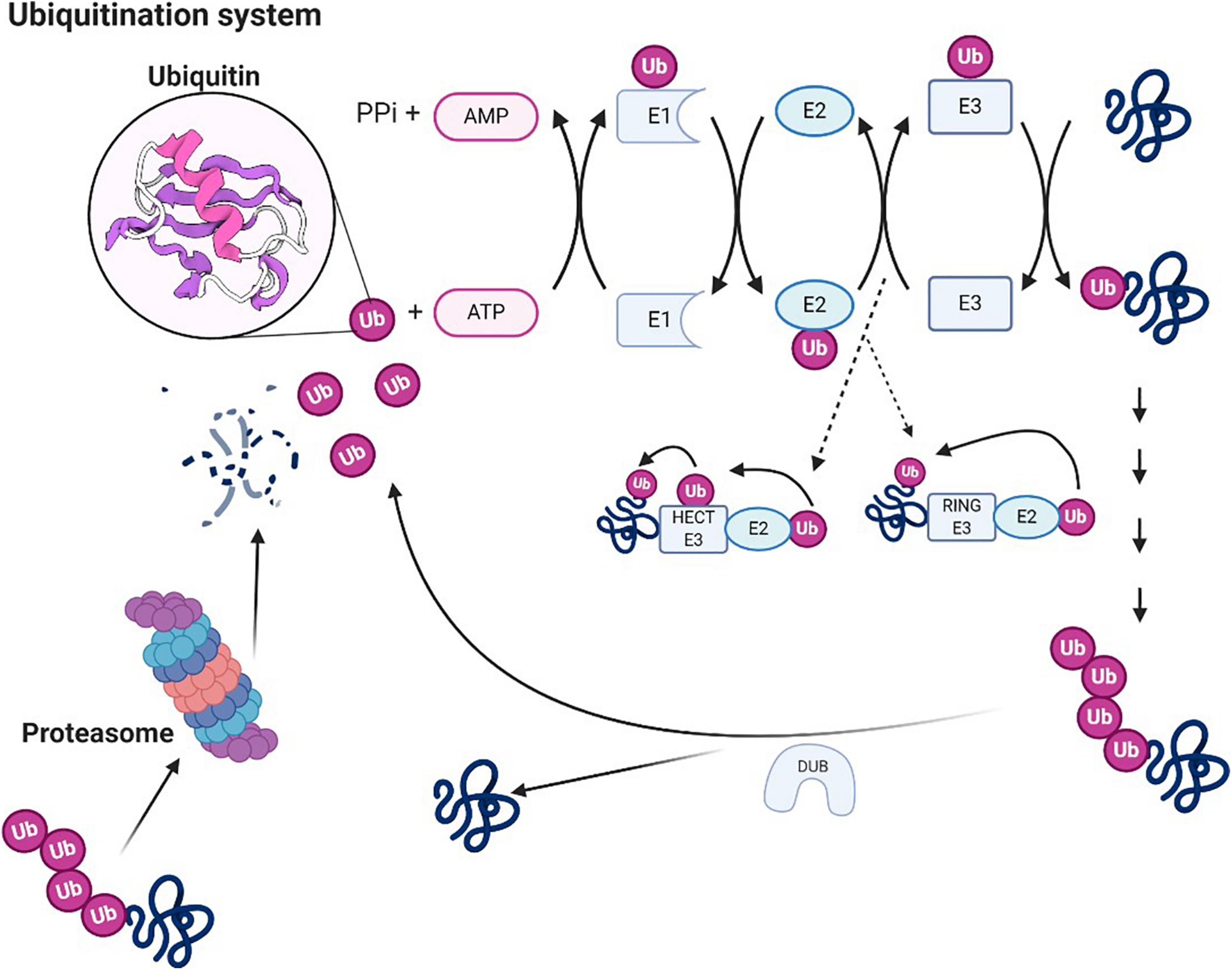 Ubiquitin system. Ubiquitin molecules can be covalently linked to other substrates to form ubiquitin chains. A chain of four or more ubiquitin units constitutes proteasome 26S. Ubiquitin is an ATP-dependent process catalyzed by three enzymes (E1, E2, and E3), which also confer specificity to the process. The first reaction catalyzed by E1 is responsible for the activation of ubiquitin. E1 transfers ubiquitin on cysteine to E2. Through the activity of transferase, E2 transfers the ubiquitin to E3 ligase (two groups of protein ubiquitin ligase, HECT E3 enzymes and ring E3s, the way they transfer ubiquitin is exactly different), which binds ubiquitin to the Lys residue of the target protein. Polyubiquitinated protein can be degraded by 26S proteasome, and ubiquitin can be recovered under the action of the deubiquitinating enzyme.