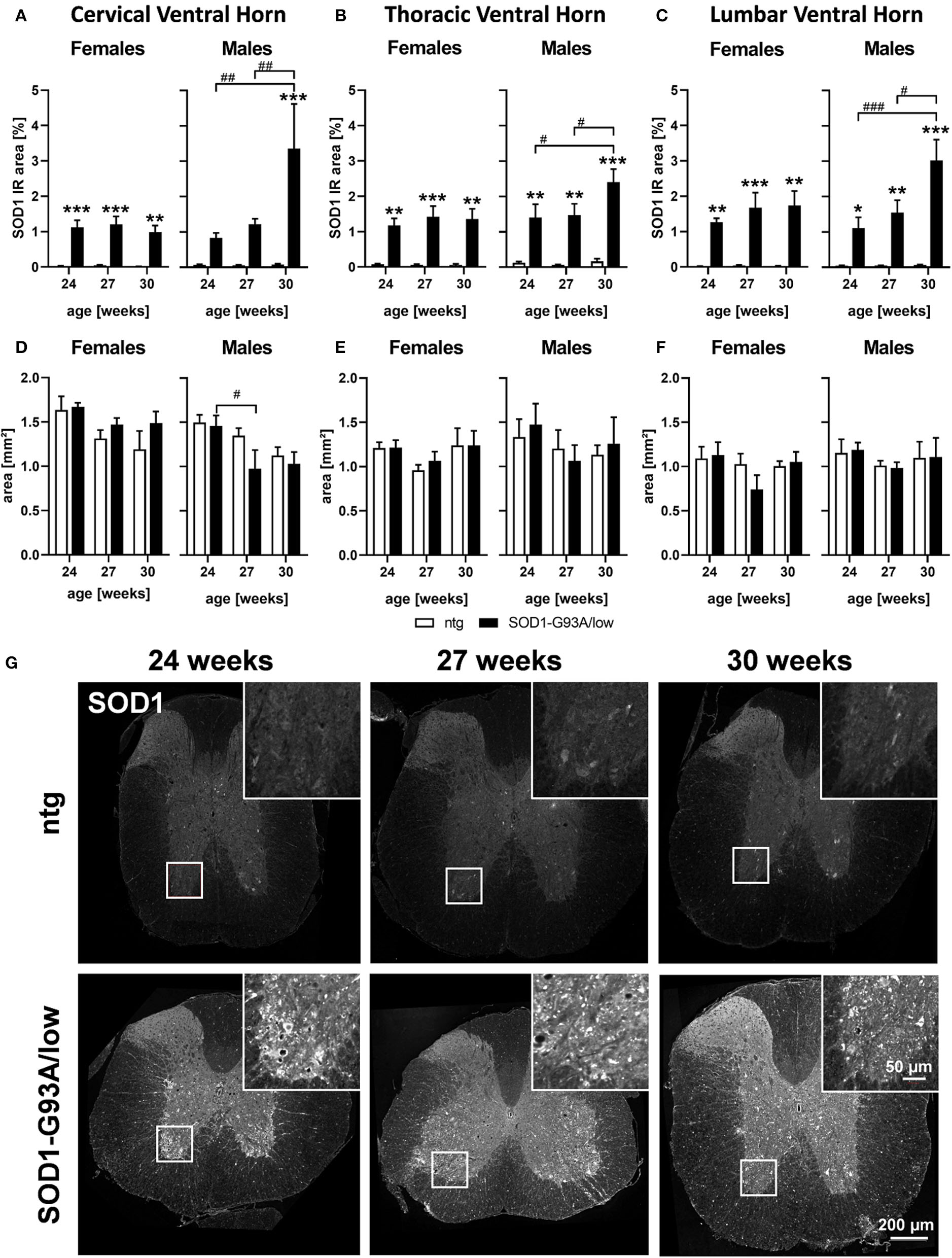 Human SOD1 levels were evaluated in the spinal cord of 24, 27, and 30 weeks old female and male SOD1-G93A/low mice and ntg littermates. The SOD1 immunoreactive (IR) area in all three ventral horn regions of female SOD1-G93A/low mice was already highly increased at the age of 24 weeks and stayed stable with age (Figures 1A–C). Evaluation of male SOD1-G93A/low mice showed similar SOD1 IR area levels at the age of 24 and 27 weeks than female animals, but at the age of 30 weeks, an additional increase in SOD1 levels compared to younger male SOD1-G93A/low mice was measurable (Figures 1A–C). Particularly in the lumbar ventral horn, a progressive increase of SOD1 levels could be observed in male SOD1-G93A/low mice (Figure 1C).