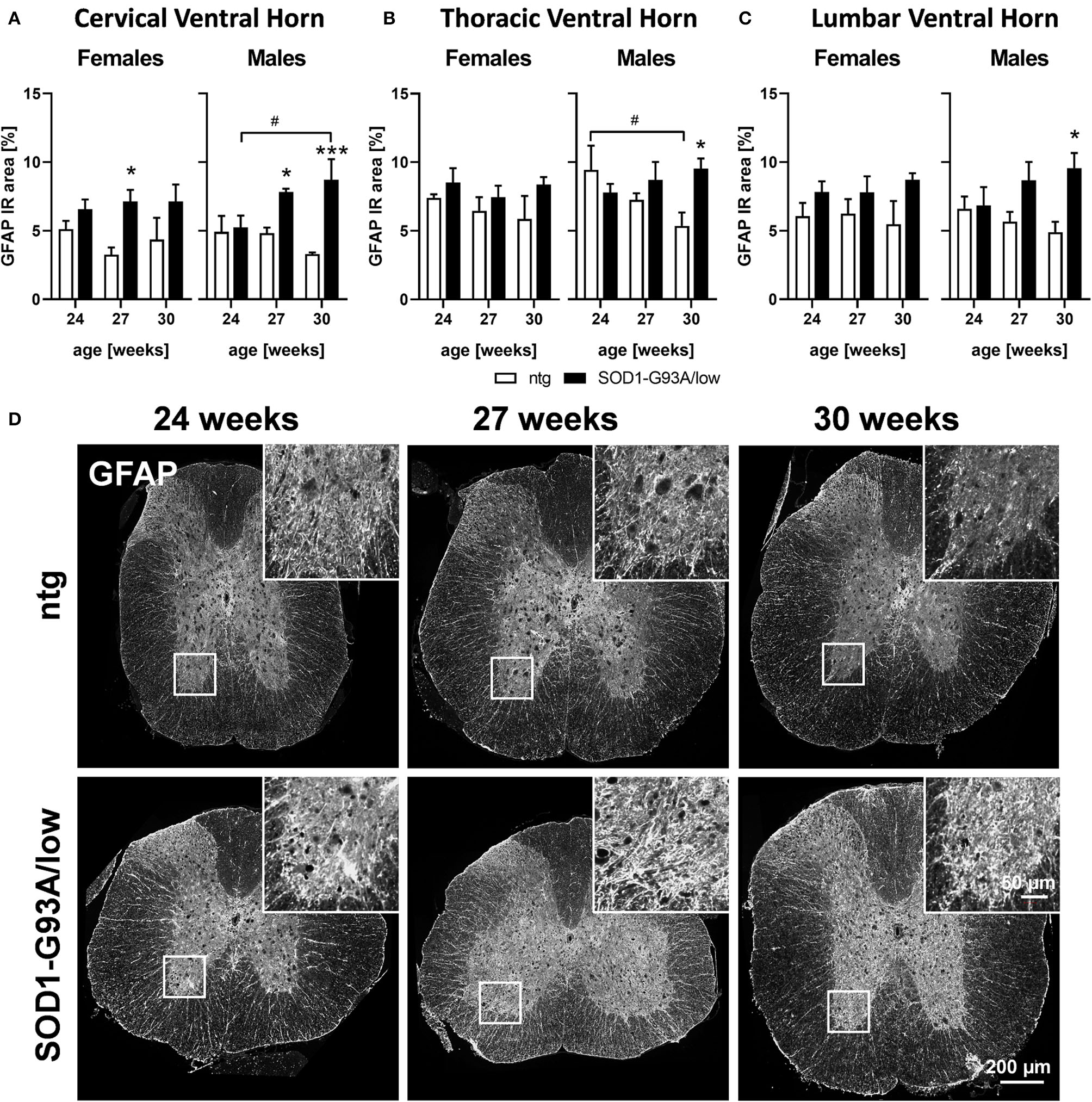 Astrocytosis in the spinal cord of 24–30 weeks old SOD1-G93A/low mice. Female and male 24, 27, and 30 weeks old SOD1-G93A/low mice were evaluated for glial fibrillary acidic protein (GFAP) expression (A–C) in the cervical (A), thoracic (B), and lumbar (C) ventral horn compared to ntg littermates. Two-way ANOVA with Tukey's and Sidak's multiple comparison post hoc test; n = 4 per group. Mean + SEM. */#p < 0.05, ***p < 0.001. *Differences between genotypes; #differences between age groups. (D) Representative images of GFAP labeling in the thoracic spinal cord of 24, 27, and 30 weeks old male SOD1-G93A/low mice compared to ntg littermates.