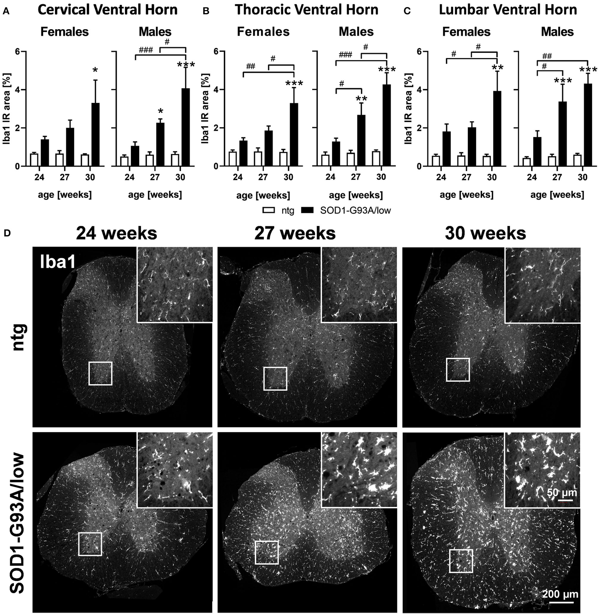 Evaluation of activated microglia in SOD1-G93A/low mice showed a progressively increasing Iba1 IR area from 24 to 30 weeks of age in all analyzed ventral horn areas of female and male SOD1-G93A/low mice. Differences observed with age were significant in all ventral horn areas of female and male SOD1-G93A/low mice, except the cervical ventral horn of female SOD1-G93A/low mice (Figure 3A). At the age of 30 weeks, the Iba1 IR area of female SOD1-G93A/low mice was increased in all ventral horn areas compared to ntg littermates, while in male animals a significant effect could already be observed at 27 weeks of age. Iba1 IR area of ntg animals stayed very low throughout all age groups (Figures 3A–C).