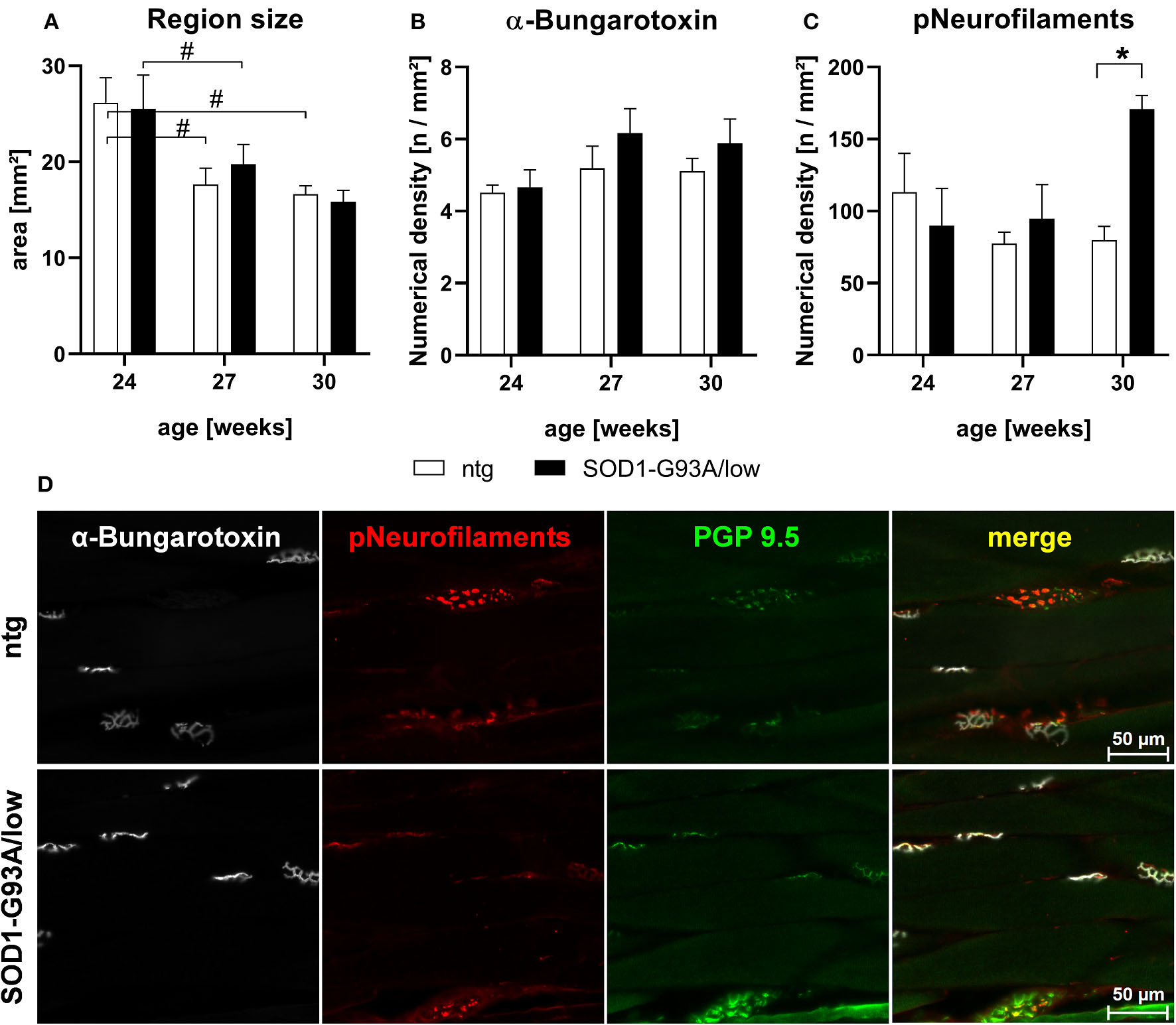 Histological analysis of the musculus gastrocnemius of 24–30 weeks old SOD1-G93A/low mice. The musculus gastrocnemius of 24, 27, and 30 weeks old male SOD1-G93A/low mice was evaluated for region size (A), numerical density of acetylcholine receptors at the postsynaptic surface of neuromuscular junctions by fluorophore-conjugated α-bungarotoxin labeling (B), and numerical density of phosphorylated neurofilaments (C) compared to ntg littermates. Two-way ANOVA with Tukey's and Sidak's multiple comparison post hoc test; n = 4 per group. Mean + SEM. */#p < 0.05. (D) Representative images of α-bungarotoxin (white), phosphorylated neurofilaments (pNeurofilaments, red), and protein gene product (PGP) 9.5 (green) triple labeling in the musculus gastrocnemius of a 30 weeks old male SOD1-G93A/low mouse compared to ntg littermate.